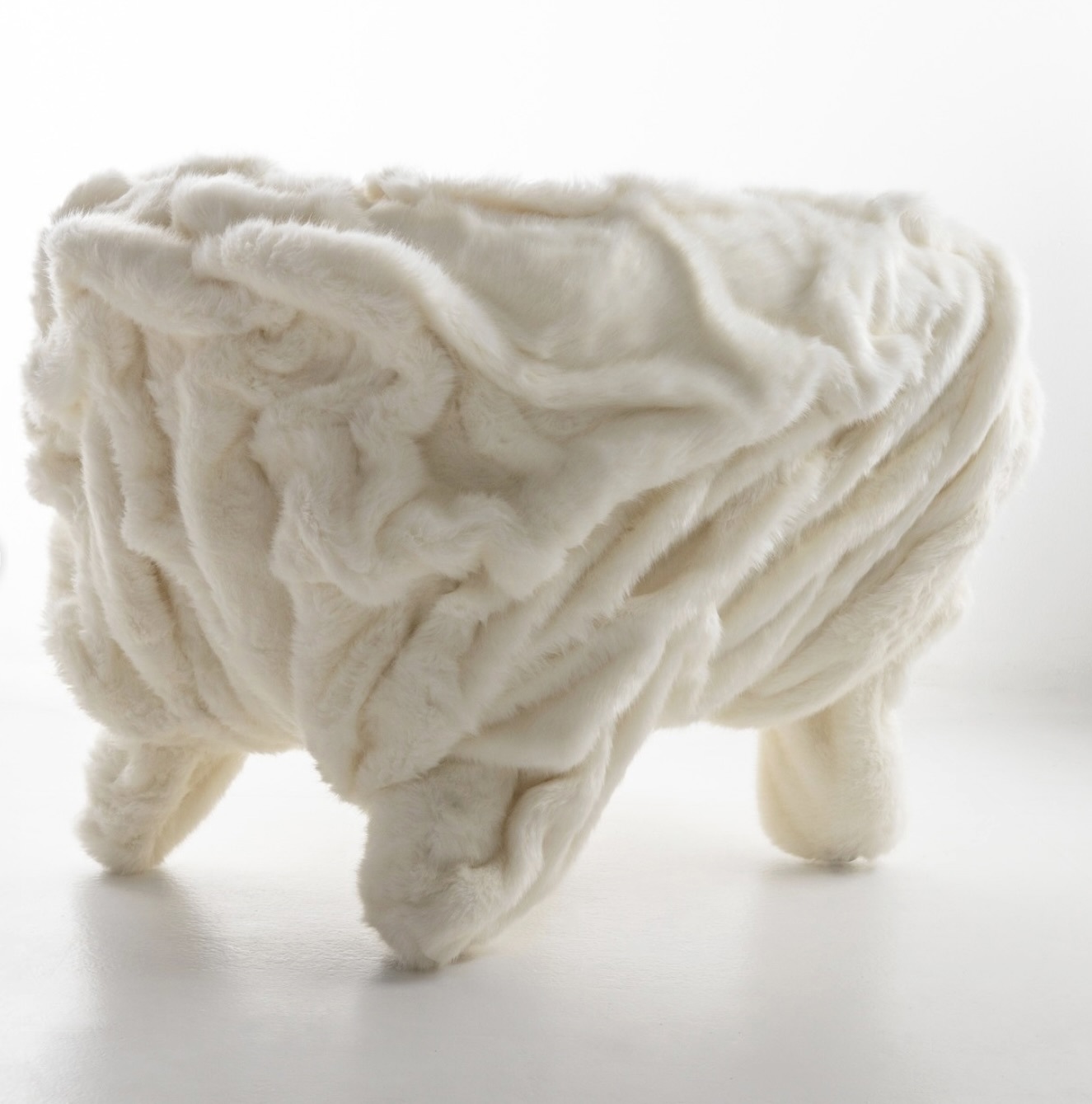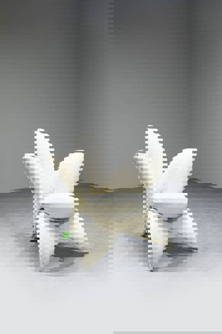 Iconica la riproposizione della Grinza dei fratelli Campana in una versione appositamente concepita per l’occasione: la Grinza White. Rivestita in eco-pelliccia bianca, la poltrona non vuole rappresentare il paesaggio alpino, ma rielaborarne alcune condizioni fisiche – il freddo, l’ingannevole sensazione di morbidezza del ghiaccio e della neve, l’idea di protezione – traducendole in un’esperienza sensoriale. La struttura irregolare e piegata, che caratterizza il progetto originario, mantiene la propria tensione formale irrisolta: non è una presenza rassicurante, non è un’icona levigata, ma una forma che conserva tracce di tensione e instabilità. Accanto alla Grinza, altri arredi storici di Edra vengono inseriti nello spazio senza gerarchie decorative, contribuendo a costruire un ambiente in cui l’oggetto non è mai isolato, ma sempre in relazione. Il Pack, divano trasformabile di Francesco Binfaré, porta l’idea stessa di arredo su un piano figurativo e narrativo, mentre le Getsuen Chairs di Masanori Umeda, sedute-scultura ispirate alla forma di un fiore stilizzato, con petali sovradimensionati, colori netti e una struttura che occupa lo spazio in modo espansivo, interrompono qualsiasi pretesa di neutralità funzionale, imponendo una presenza formale che obbliga lo spazio a riorganizzarsi attorno all’oggetto.