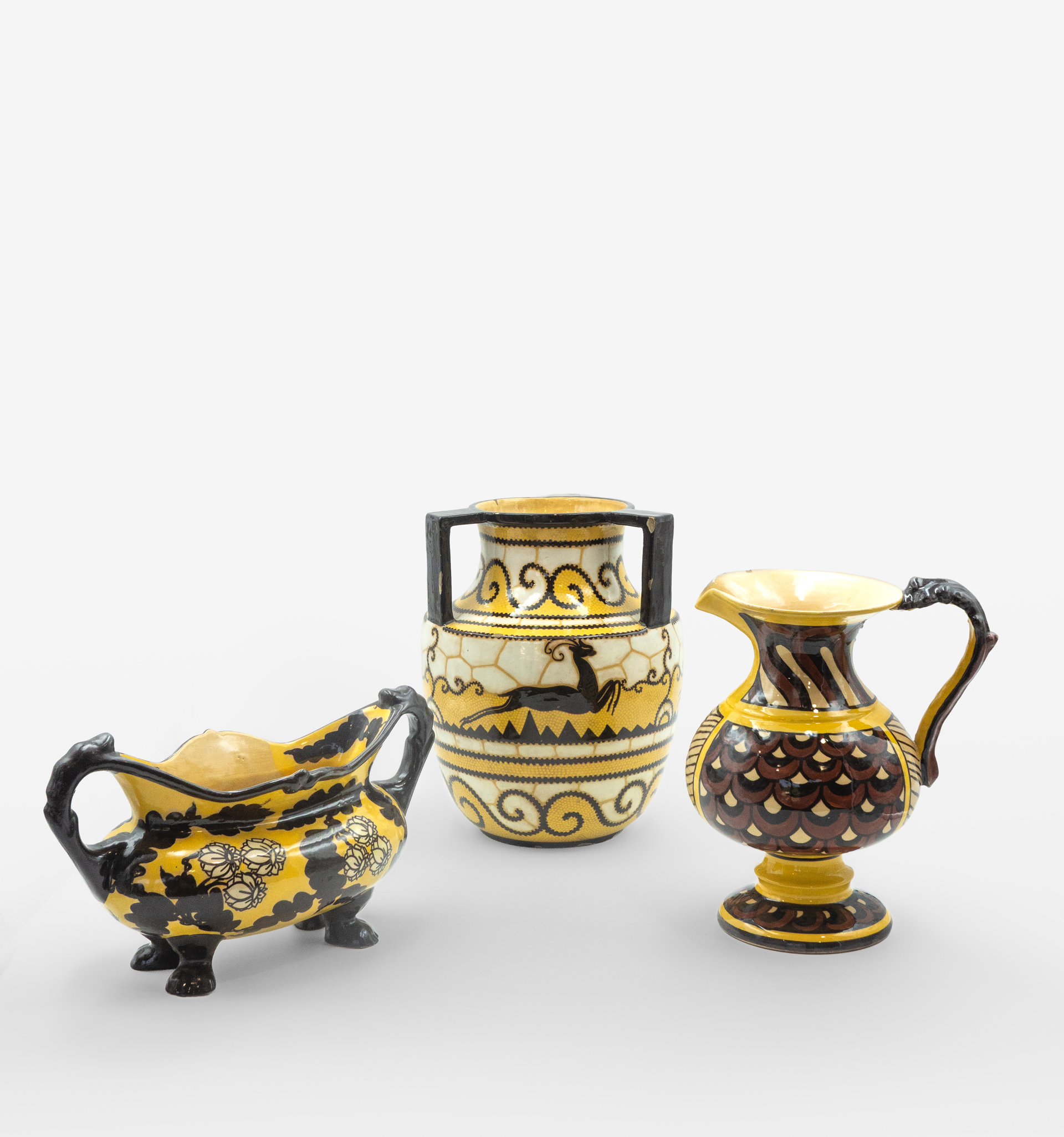 A sinistra: Centrotavola, decoro floreale, terracotta dipinta sotto cristallina. Manifattura: ILSA, Albissola Capo. Al centro: Vaso con manici retti, decoro ad animali su mosaico, terracotta dipinta sotto cristallina, fine anni ’20. Manifattura: ILSA, Albissola Capo. A destra: Brocca, decoro di gusto rinascimentale, metà anni Venti, maiolica. Manifattura: M.G.A. Mazzotti Albissola Marina Collezione Barbara Checcucci, Albisola Superiore. Photo: Claudio Pagnacco