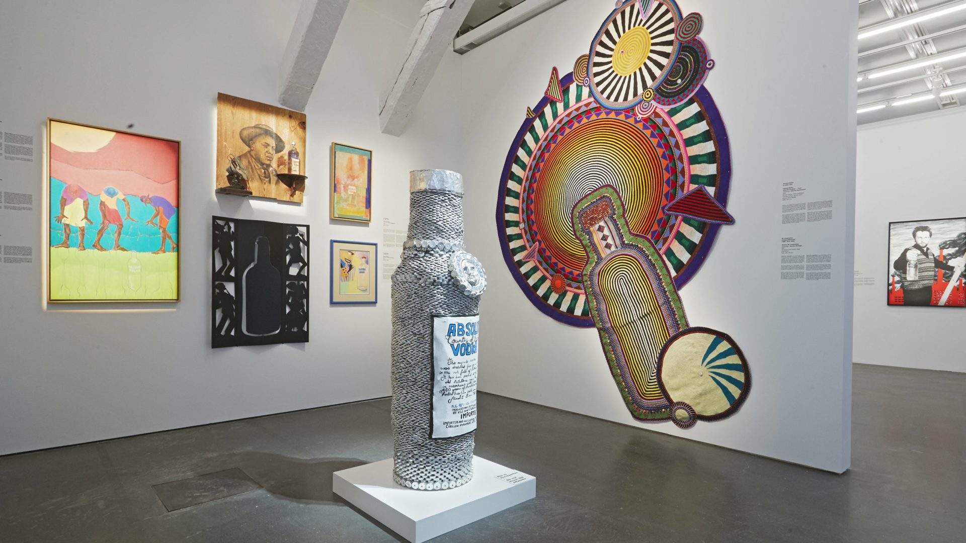 La prima opera realizzata per Absolut Vodka è Absolut Warhol (1986). Secondo la versione che circolava all’epoca, sarebbe stato lo stesso Andy Warhol a suggerire l’idea durante una cena, manifestando interesse per la bottiglia. L’interlocutore, l’importatore americano del marchio, avrebbe colto immediatamente la possibilità di coniugare l’identità di Absolut con l’arte contemporanea; Warhol indicò poi altri artisti con cui collaborare, tra cui Keith Haring e Kenny Scharf. Nelle opere di Keith Haring presenti in mostra, la bottiglia entra nel suo alfabeto visivo fatto di figure stilizzate, energia urbana e ritmo grafico, diventando parte di un immaginario legato alla street culture newyorkese degli anni Ottanta. Con Louise Bourgeois il registro cambia radicalmente: la bottiglia assume una dimensione più intima e ambigua, caricandosi di tensioni emotive e allusive, coerenti con la sua riflessione su corpo, memoria e vulnerabilità. David Shrigley ne fa un oggetto ironico e destabilizzante, utilizzato per scardinare le aspettative della comunicazione pubblicitaria. La forza della Absolut Art Collection risiede nella sua eterogeneità dichiarata. Artisti di fama internazionale convivono con nomi locali meno noti; linguaggi alti e registri pop si sovrappongono senza gerarchie. Al suo interno emergono nuclei che raccontano luoghi e momenti storici precisi: la scena dei writer newyorkesi degli anni Ottanta, artisti russi che reagiscono alla censura durante la dissoluzione dell’Unione Sovietica, una significativa presenza di artisti afroamericani, fino agli Young British Artists degli anni Novanta. Tre decenni in cui Absolut Vodka si è trasformata in committente, costruendo un archivio dell’evoluzione dei linguaggi dell’arte contemporanea internazionale.