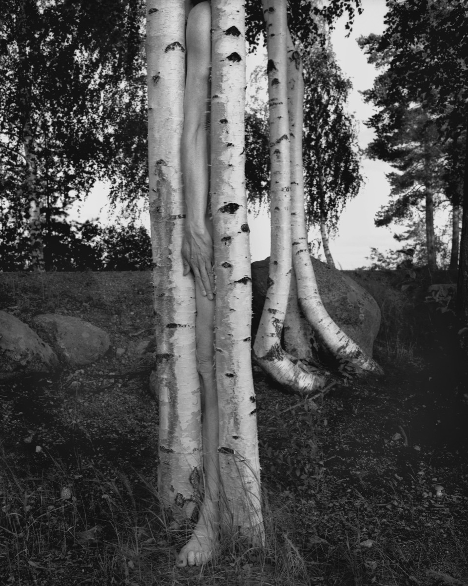 Pioniere dell’invenzione visiva e votato alla ricerca sul proprio corpo in rapporto a forma e spazio, Minkkinen sintetizza le tappe di una personale storia del nudo attraverso codici di narrazione opposti alle consuete modalità della fotografia di tale genere: l’ossessivo e solitario auto-ritrarsi nel nordico paesaggio lacustre e successivamente in altre ambientazioni naturalistiche e urbane, attraverso le infinite scale di grigi e i raffinati toni del bianconero.
