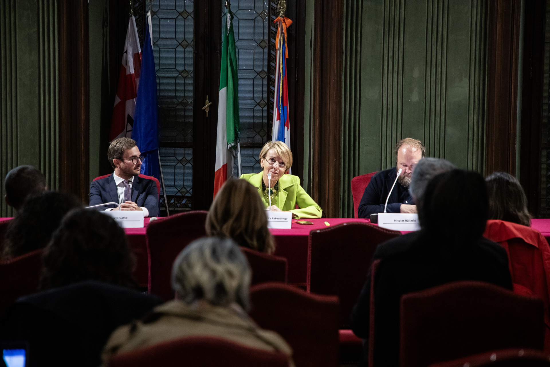 Conferenza stampa di presentazione ufficiale della candidatura di Alba come Capitale italiana dell’Arte Contemporanea 2027. Nell'immagine, da sinistra, Alberto Gatto, Patrizia Sandretto Re Rebaudengo e Nicolas Ballario.