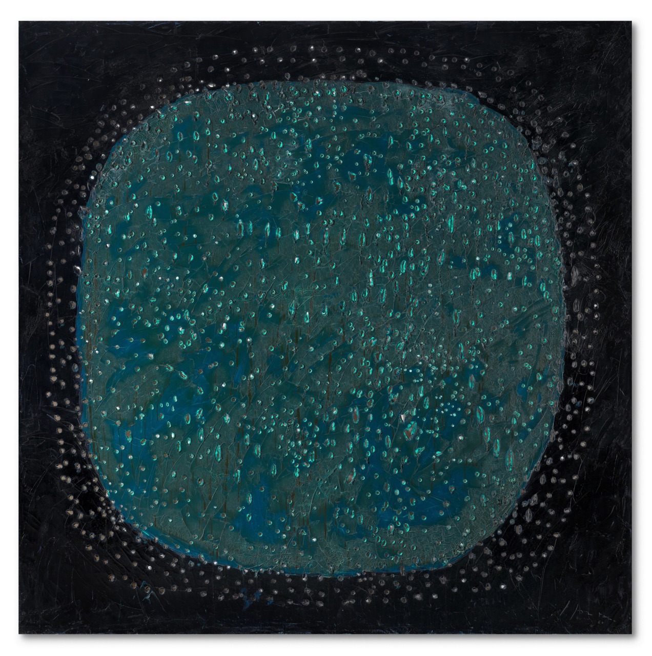 Un pianeta lontano o forse un meteorite scintillante, senza dubbio una scheggia di un universo che sconfina oltre le coordinate visive usuali. Il «Concetto Spaziale» di due metri realizzato da Lucio Fontana nel 1960 fa parte della rivoluzionaria serie degli «Olii» e costituisce una tela rara, originale e imponente. Perforata da buchi bordati di verde e disseminata di vetri che le conferiscono un’aura luminosa ed enigmatica al contempo, anticipa le invenzioni più ardite e materiche sperimentate da Fontana con la serie «La Fine di Dio». Insieme ad altre quattro opere del maestro spazialista, il 4 marzo va all’incanto (stima 8,5-12 milioni di sterline) da Sotheby’s a Londra, con lavori di Alberto Giacometti e Sam Francis, tutti provenienti da un’importante collezione privata tedesca che li ha custoditi per oltre sessant’anni.