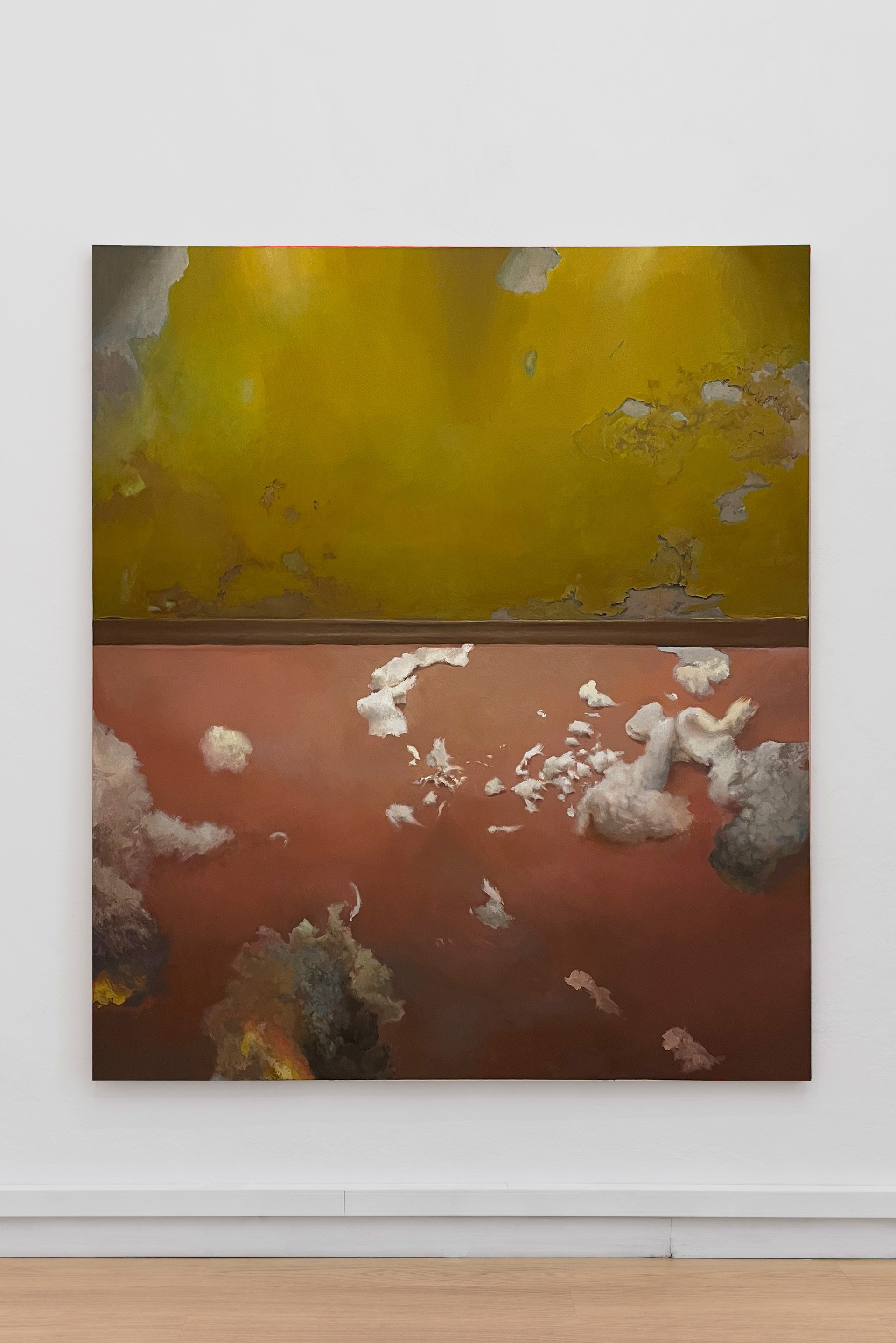 Diversa la direzione del lavoro di Nicolai. Goriziano classe 1988, muove tra figurazione e astrazione costruendo immagini per accostamenti e slittamenti di senso. Oggetti e frammenti del quotidiano vengono inseriti in composizioni ambigue, dove il significato è legato ad associazioni instabili. In Cotone reverso un elemento minimo, come il cotone appoggiato a terra, produce un ribaltamento dello spazio e del tempo: il pavimento diventa cielo, il materiale assume la forma di una nuvola e l’interno diventa un luogo aperto e privo di confini.