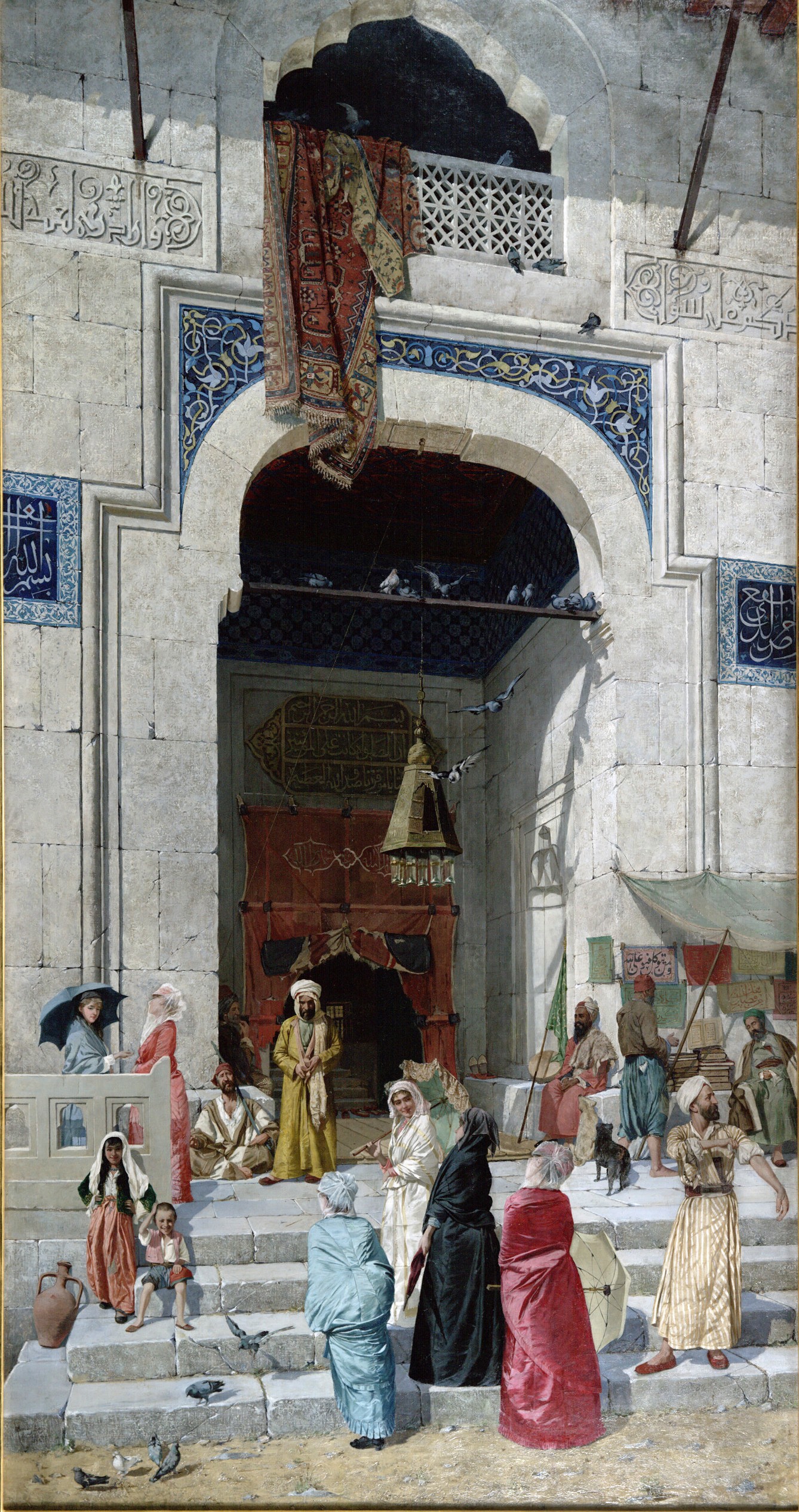 Ambientato davanti all’ingresso principale della moschea Muradiye di Bursa, un luogo che Hamdi raffigurò in almeno altri quattro dipinti, il quadro rinuncia a una narrazione esplicita. Non c’è un evento, non c’è un racconto sacro: c’è piuttosto una soglia, fisica e simbolica. Le donne avvolte nel ferace, soprabito indossato di norma fuori casa, ancorano la scena alla contemporaneità ottomana, mentre l’architettura, enfatizzata e riassemblata quasi come un collage, fornisce il necessario ancoraggio storico per lo sguardo europeo.