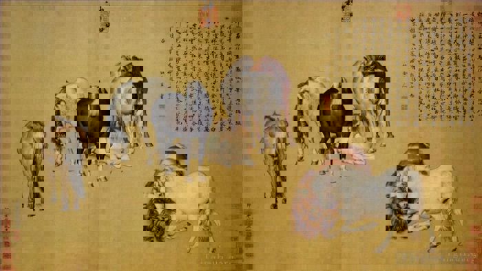 Con il passaggio alla dinastia Song (960-1279), l’attenzione si sposta progressivamente dalla monumentalità dei volumi alla vitalità del segno. Un esempio emblematico è Cinque cavalli di Li Gonglin (XI secolo), raffinato studioso e pittore di corte. L’opera presenta cinque destrieri condotti da palafrenieri stranieri, ognuno caratterizzato con sottile introspezione psicologica. Qui il cavallo diventa occasione per esercitare una linea colta, controllata, quasi esasperata nella precisione dei dettagli. Non c’è enfasi muscolare, ma eleganza descrittiva. L’animale è osservato, studiato, individualizzato. Tra dinastia Song e Yuan prende forma anche il celebre tema degli Otto Cavalli del re Mu, soggetto che attraverserà i secoli. In queste composizioni, spesso sviluppate in lunghi scroll paintings orizzontali, i cavalli sono raffigurati in corsa tra rocce e paesaggi stilizzati. Il dinamismo è accentuato da diagonali marcate e dal ritmo alternato delle posture. Il tema, carico di riferimenti mitici, allude alla velocità sovrumana e all'anelito di successo; non a caso, diventerà motivo decorativo frequente negli spazi domestici, come augurio di progresso sociale.