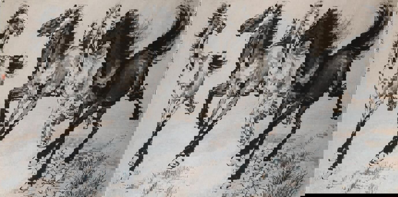 Nel XIX secolo, con le crisi interne e le pressioni coloniali, l’arte tradizionale entra in una fase di ripensamento. Alcuni artisti guardano al passato come a un repertorio da preservare; altri iniziano a interrogarsi su come rinnovare il linguaggio pittorico. È in questo clima che si prepara il terreno per la svolta del XX secolo con Xu Beihong. Il suo cavallo non nasce nel vuoto: eredita la linea energica dei letterati Ming, il revival storico di Zhao Mengfu e persino la sensibilità volumetrica introdotta a corte in epoca Qing. Ma Xu sintetizza tutto in una figura nuova, dinamica, spesso lanciata al galoppo, trasformando l’animale in simbolo di rigenerazione nazionale. I suoi cavalli – spesso raffigurati al galoppo, con zampe distese e criniere sferzate dal vento – sono costruiti attraverso contrasti tra campiture dense e tocchi rapidi. In opere come Galloping Horse, la sintesi tra volume realistico e gesto calligrafico produce un’immagine di forza liberata.