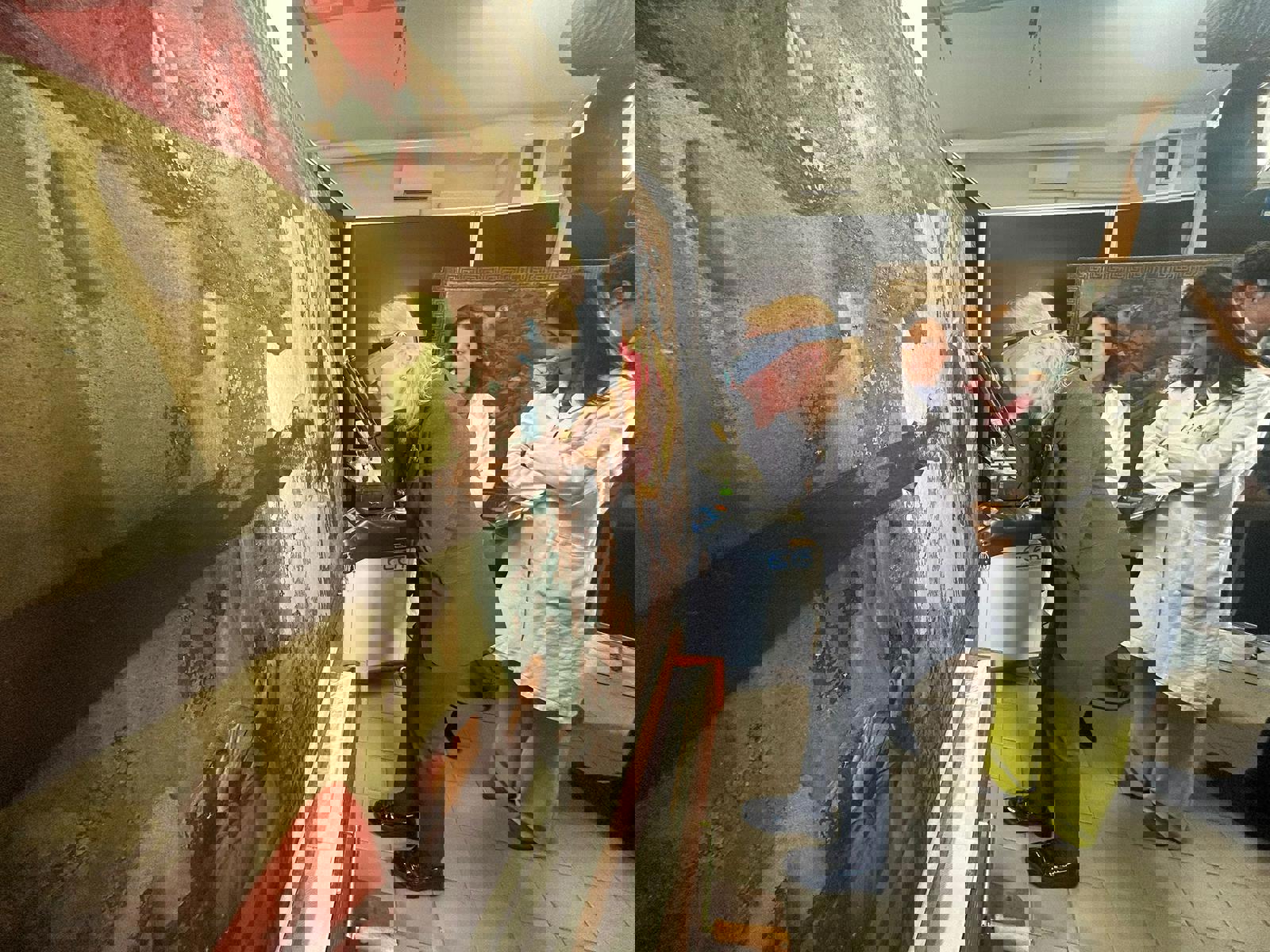 Carmen C. Bambach del Metropolitan Museum di New York esamina lo «Stendardo della Santissima Trinità» di Raffaello, di Città di Castello, nel laboratorio dell’Istituto centrale del restauro a Roma. Foto Comune di Città di Castello