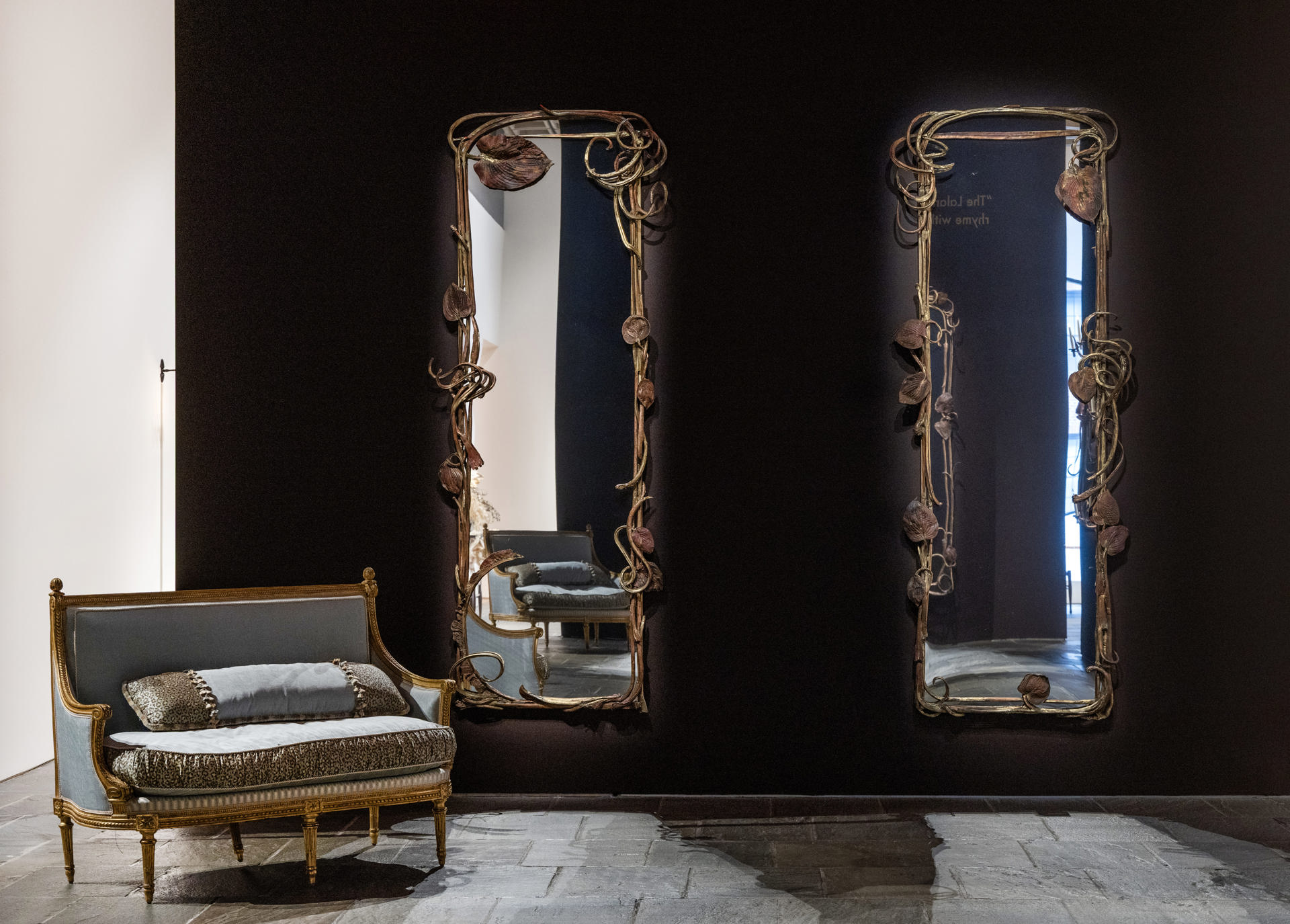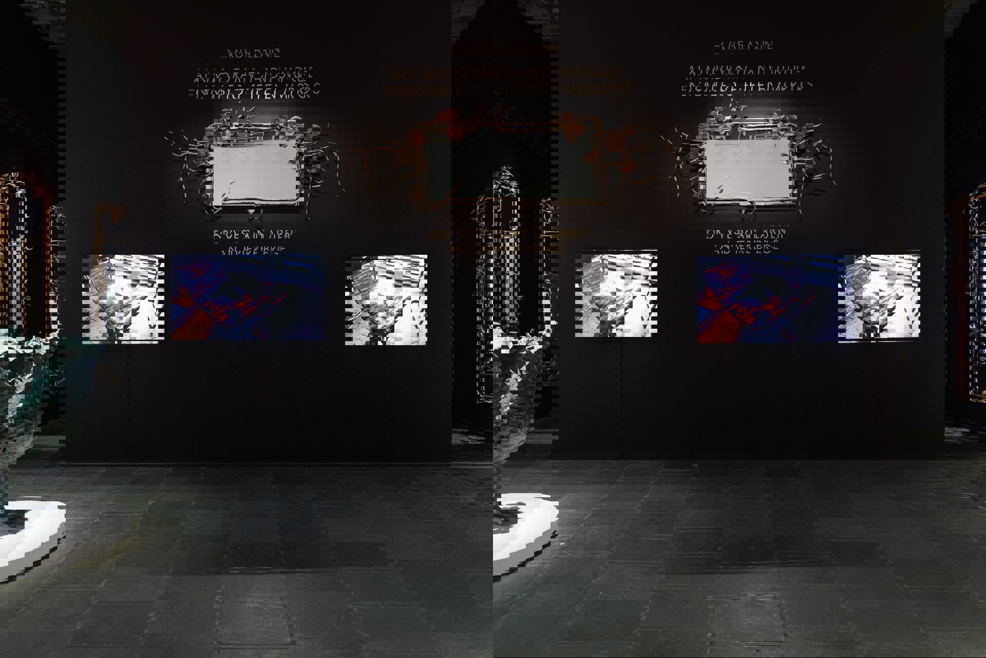 Per comprendere il valore intrinseco di questo insieme, è necessario tornare al 1974, quando l'opera fu commissionata da Yves Saint Laurent e Pierre Bergé per il celebre «Salon de Musique» della loro residenza parigina, uno degli interni più iconici del XX secolo. Inizialmente concepito come una coppia di specchi - i primi lavori in assoluto realizzati da Claude con questa funzione - il progetto si è espanso nell'arco di un decennio fino a diventare un'installazione ambientale totale. Ogni pezzo è stato forgiato interamente a mano utilizzando bronzo dorato, rame galvanizzato e vetro specchiato, con cornici impreziosite da foglie ed elementi naturali tratti direttamente dal giardino dell'artista.