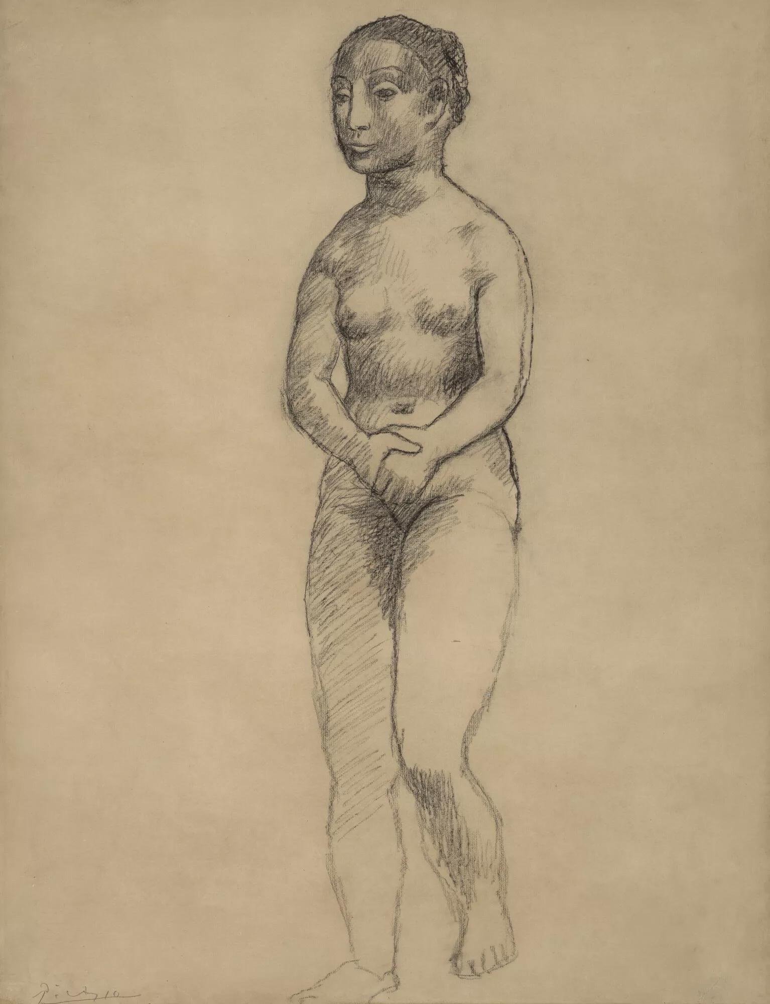 Pablo Picasso (1881 -1973), Femme nue debout aux mains croisées Signed 'Picasso' (lower left) Drawn in Gósol in 1906 Conté crayon on paper , 61.2 x 47.3 cm. Estimate : €1,200,000 -1,800,000 © Christie’s images LTD 2026