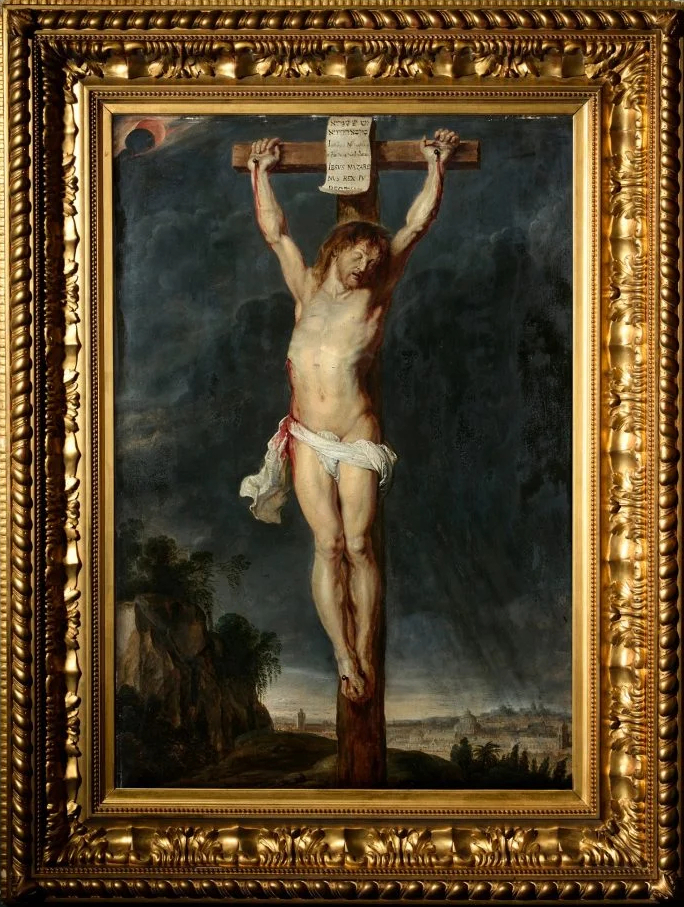 Lo studioso ha inoltre descritto alcuni aspetti che confermano la tipica impronta rubensiana: il corpo di Cristo, isolato e luminoso contro un cielo minaccioso; la posa inclinata in avanti, resa con un realismo doloroso sottolineato dalla tensione delle braccia; la città di Gerusalemme visibile sullo sfondo, rischiarata da una luce instabile mentre un temporale sembra avvicinarsi dietro le rocce del Golgota. Questa attenzione al dettaglio, sia emotivo sia atmosferico, è una caratteristica inconfondibile del pittore fiammingo.