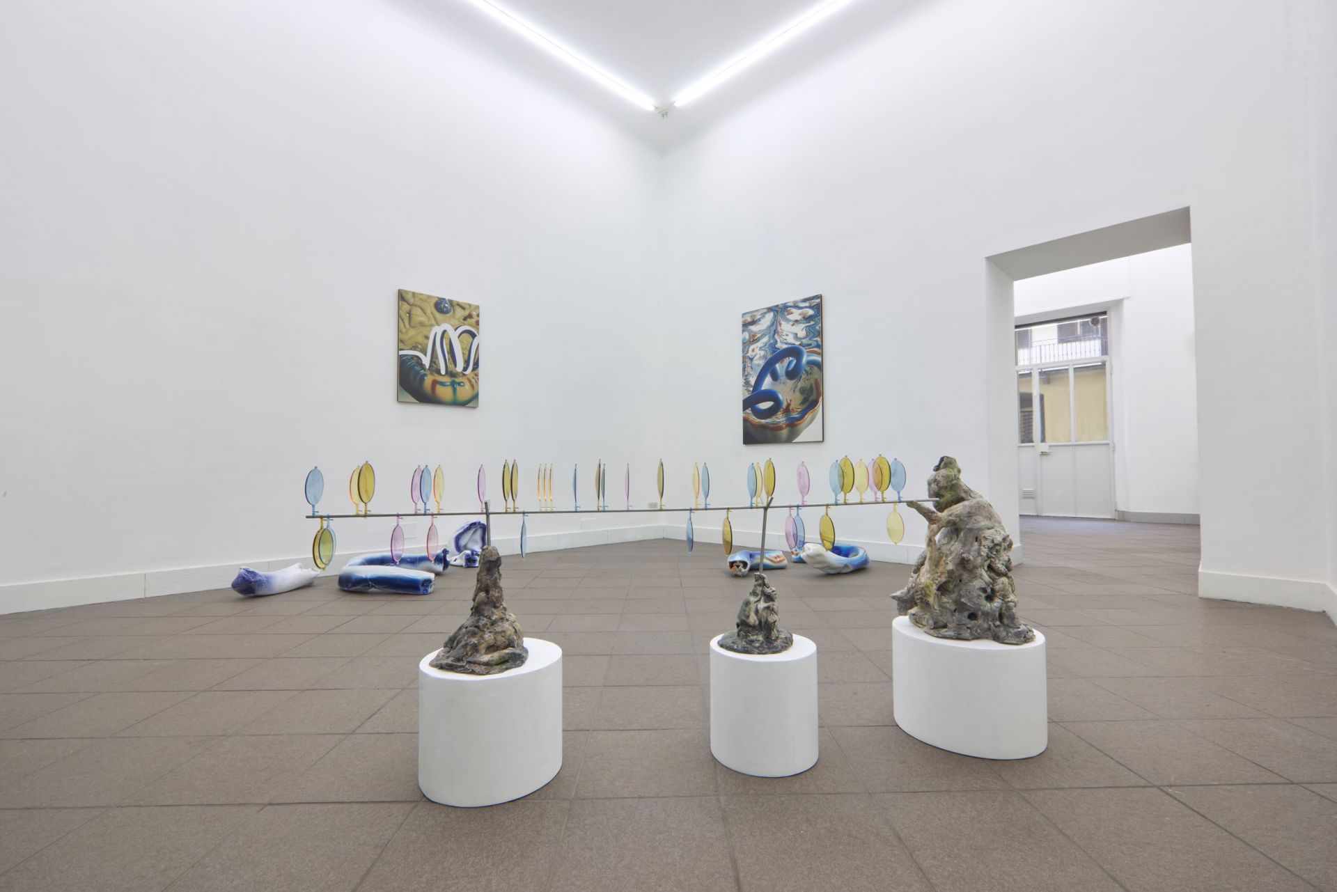 Installation view con le opere di Leilei Wu, all'interno della mostra collettiva "Myths from Smoldering Skies", Limbo Contemporary, Milano.