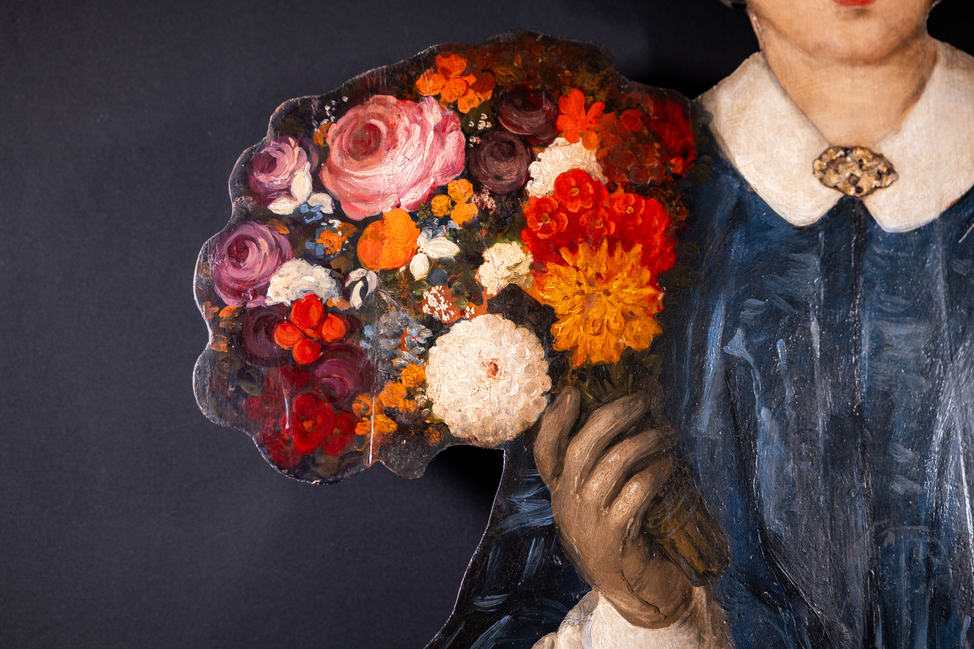 Ultimo intervento (sostenuto da Italia Nostra-sezione di Milano e realizzato da Grazia Cavanna e Renato Gualdani di concerto con la Soprintendenza competente) è quello su un pezzo raro e singolare, il «Ritratto sagomato di Amanzia Guerillot» (1856-59), la giovanissima seconda moglie di Angelo Inganni (Brescia, 1807-Gussago, 1881), pittrice anche lei. Un’opera curiosa, giunta in museo nel 1976 con il lascito di Paolina Farnesi Mazza, vedova del pittore Aldo Mazza (al cui nonno, pittore anch’egli, Angelo Inganni stesso lo aveva donato), che ci mostra, in dimensioni reali, la giovane donna (Milano, 1828–Boffalora sopra Ticino, 1905) sorridente, un grande mazzo di fiori in una mano, sull’uscio dell’ex monastero della Santissima, presso Gussago, dove la coppia abitava.