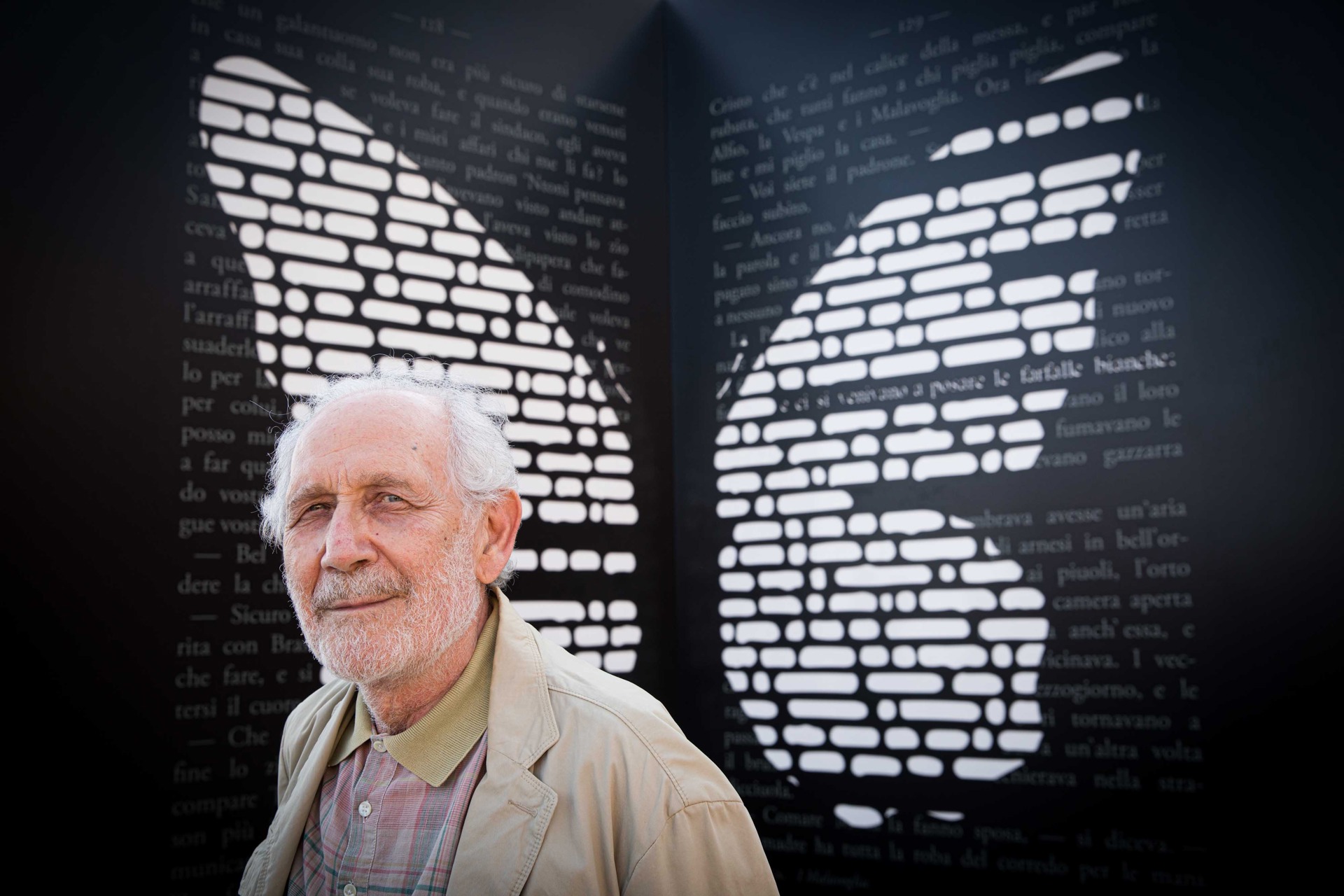 Emilio Isgrò davanti alla sua opera «La farfalla dei Malavoglia», 2022, Taormina. Photo © Iannello Fucilla