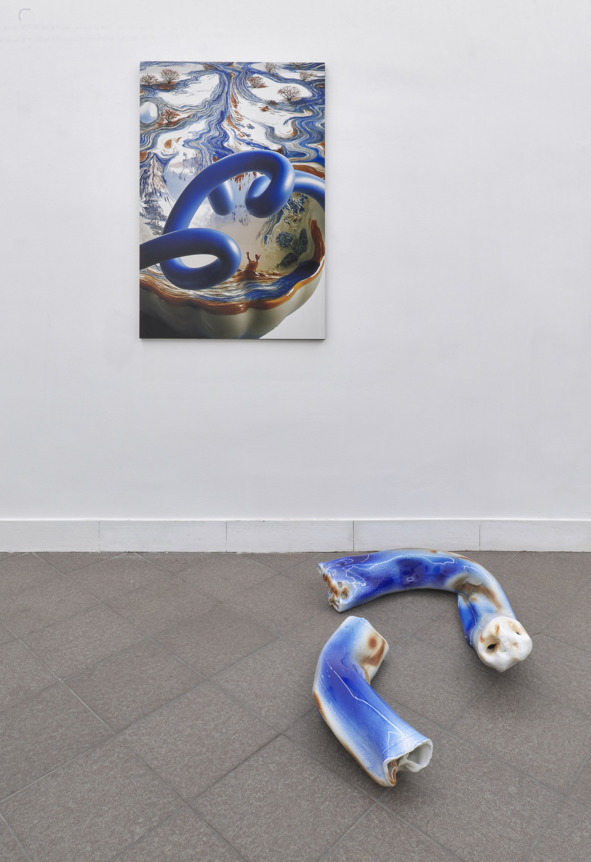 Accanto a queste opere si trovano le sculture della serie Diatomee (2025) forme organiche che sembrano provenire da un’epoca geologica remota. Le diatomee, microalghe unicellulari comparse circa 145 milioni di anni fa e responsabili di un quarto dell’ossigeno terrestre, diventano per l’artista un modello di forma vitale primaria. Ancora in tensione, come se il processo di cottura non si fosse mai davvero concluso, sono anche le opere della serie Memoria primordiale (2025). Qui la ceramica si intreccia a forme organiche in acetato, simili a tubi o cuscini di silicone, che emergono, strabordano e si insinuano nelle superfici solide e stabili della terra cotta, come se il materiale cercasse ancora di espandersi oltre i propri limiti.