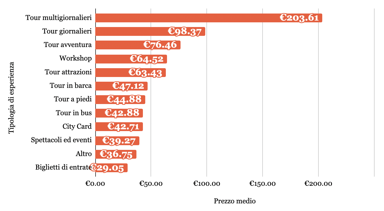 Prezzo medio per tipologie di esperienza. Fonte: elaborazione formules su dati GetYourGuide