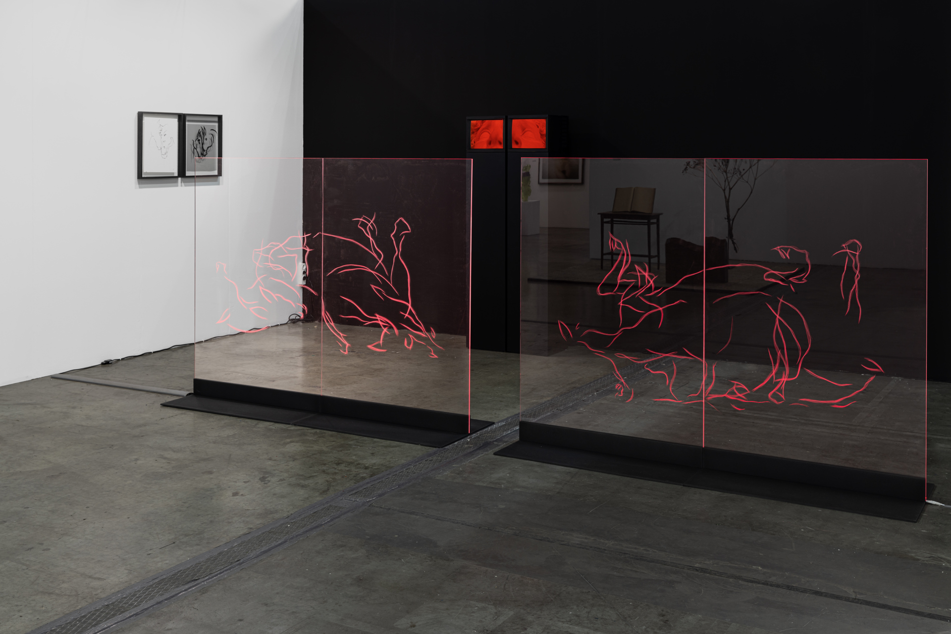 Con Sentinelle, Valentina Furian trasforma lo stand di UNA in un ambiente notturno attraversato da luce rossa e tensione animale. L’artista veneziana, che lavora principalmente con il video e l’installazione, continua la sua ricerca sul rapporto tra umano e non umano, tra controllo e vulnerabilità. L’installazione riunisce video, opere su carta e una nuova serie di incisioni su lastre di plexiglass trasparente montate su piedistalli metallici e illuminate da LED rossi, prodotte appositamente per Artissima a partire dalla personale alla Fondazione Sandretto Re Rebaudengo, dove questa tipologia di opere è apparsa per la prima volta. In dialogo con queste, il video Eclissi mostra due occhi pietrificati che fissano lo spettatore senza mai sbattere le palpebre, amplificando la tensione tra veglia e riposo, predatore e preda.