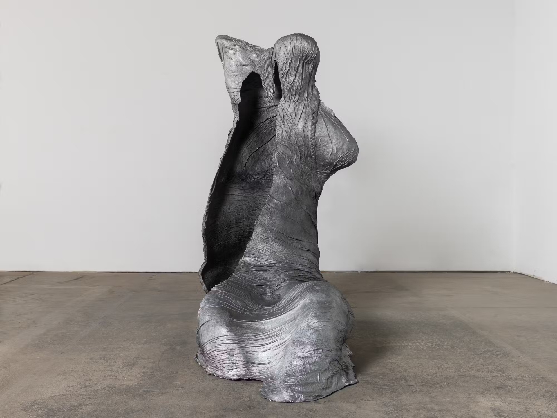 Allo stand di Fanta-MLN, Margherita Raso presenta una figura antropomorfa in alluminio avvolta in un tessuto la cui treccia si adagia sulla schiena. La scultura, sospesa tra presenza e assenza, appare congelata in una postura che ne rivela l’interno cavo: quella che sembrava una figura femminile è in realtà solo un indumento, privo di corpo. L’artista prosegue la sua indagine sul rapporto tra materia, gesto e superficie, trasformando il tessuto in un’estensione del corpo, un involucro che ne trattiene tracce e tensioni.