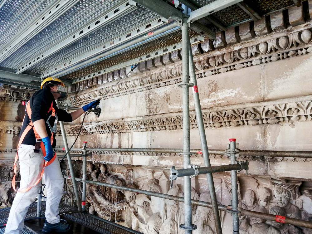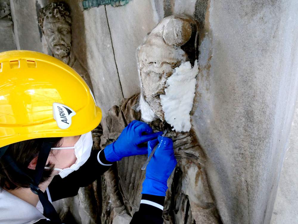 Alla domanda se i lavori hanno evidenziato precedenti interventi di restauro, risponde: «Sì, e in questo senso a essere cruciali per la conoscenza del monumento furono gli anni ’80. Nell’ambito della Legge speciale n. 92/1981, fu possibile, esattamente come oggi, accedere con comodi ponteggi al monumento e osservarne oltre alle tracce di interventi di messa in sicurezza delle strutture per mezzo di imperniaggi e cerchiaggi, anche e soprattutto lo stato di conservazione. In quel periodo furono portate avanti attività di studio delle patine di ossalato, mappature analitiche e un approccio scientifico al restauro, rilevando problemi di degradazione su tutta la superficie quali dilavamento, processi di solfatazione, fessurazioni e fratturazioni ma anche decoesione ed esfoliazione della pietra. Nelle relazioni dell’epoca si indicavano gli interventi da eseguire volti al consolidamento, alla pulitura, alla stuccatura delle superfici oltre alla sostituzione degli elementi metallici ossidati e al corretto smaltimento delle acque meteoriche e si trova documentazione di un intervento mirato nella porzione sud-occidentale del monumento».