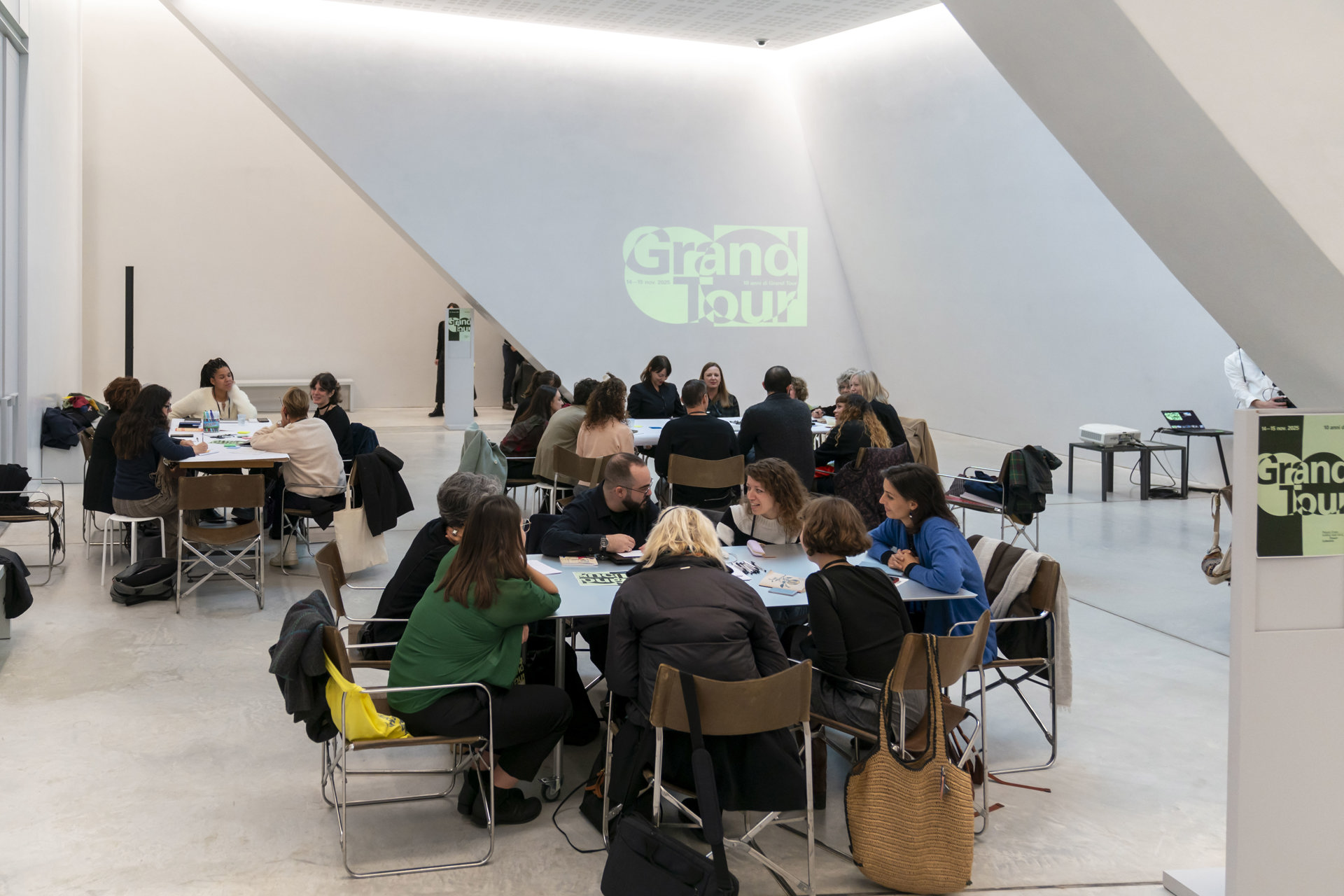 La giornata di venerdì ha visto decine di ospiti partecipare a cinque tavole rotonde disposte all’interno del Teatrino di Palazzo Grassi. Previa partecipazione è stato chiesto loro di indicare la tipologia di impiego attuale, di modo da poter essere smistati nel gruppo più consono ai propri interessi e formazione. Le cinque tematiche selezionate, in questo caso Learning, Caring, Out-reaching, Being part e Mediating & Sharing, sono state introdotte da due moderatori fissi presenti per ogni gruppo, nonché rappresentanti ciascuno di una precedente edizione di Grand Tour.