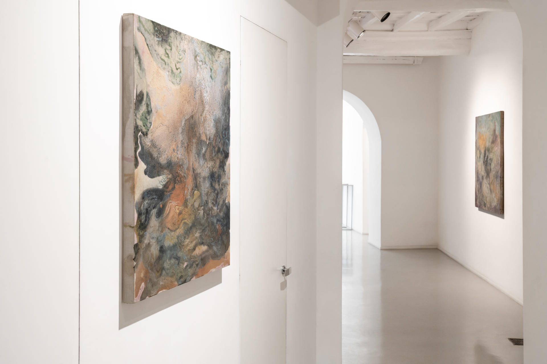 Francesca Antonini presenta «Giro di vento», la terza personale di Casadei, a cura di Marina Dacci. La mostra porta lo spettatore all’interno di un laboratorio di esperienza pittorica: il corpo dell’artista, invisibile sulla tela o sulla carta, è generativo. È la calamita che attira ciò che «dobbiamo sentire», guidandoci attraverso energie in movimento e disvelamenti continui. Il gesto di Casadei non è mai definitivo: la materia reagisce, scivola, stratifica, creando cristallizzazioni, trasparenze e tensioni temporanee.