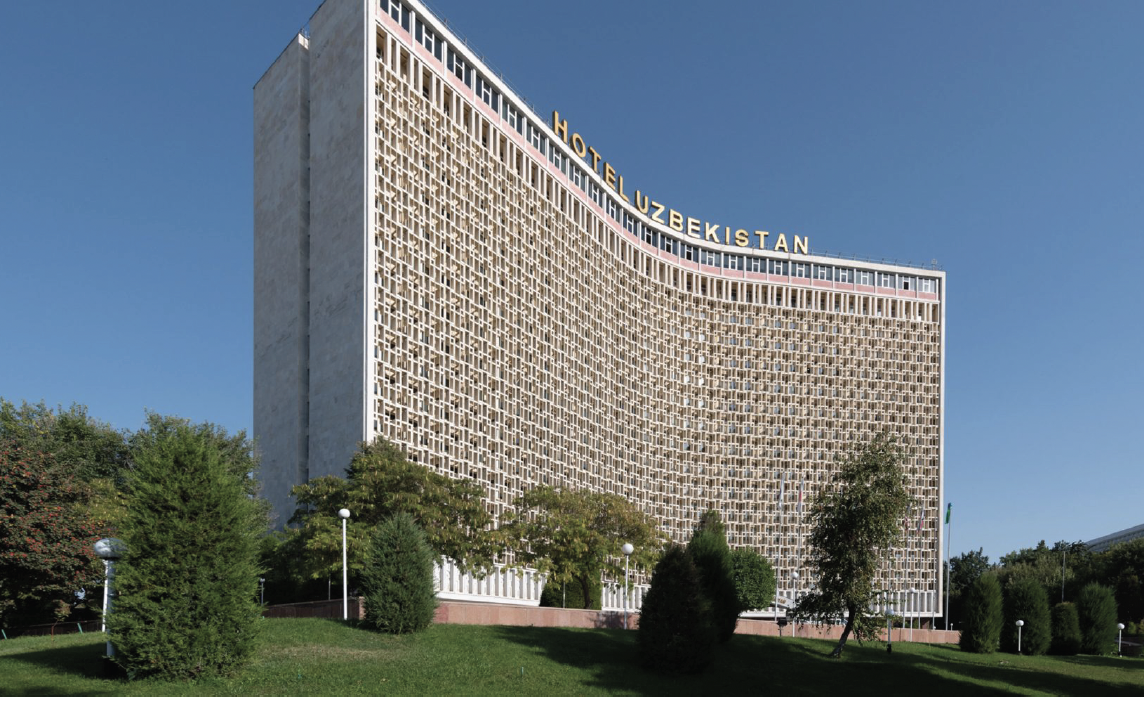 Tra i primi simboli di questa fase vi è l’Hotel Uzbekistan, progettato da V.S. Smirnov e Y.A. Rosenfeld, affacciato su piazza Amir Temur. La facciata principale è scandita da una fitta trama di frangisole in cemento prefabbricato, che filtra la luce e attenua il calore, trasformando un’esigenza climatica in un motivo architettonico distintivo. La struttura, concepita secondo criteri antisismici avanzati, combina rigore tecnico e presenza monumentale.