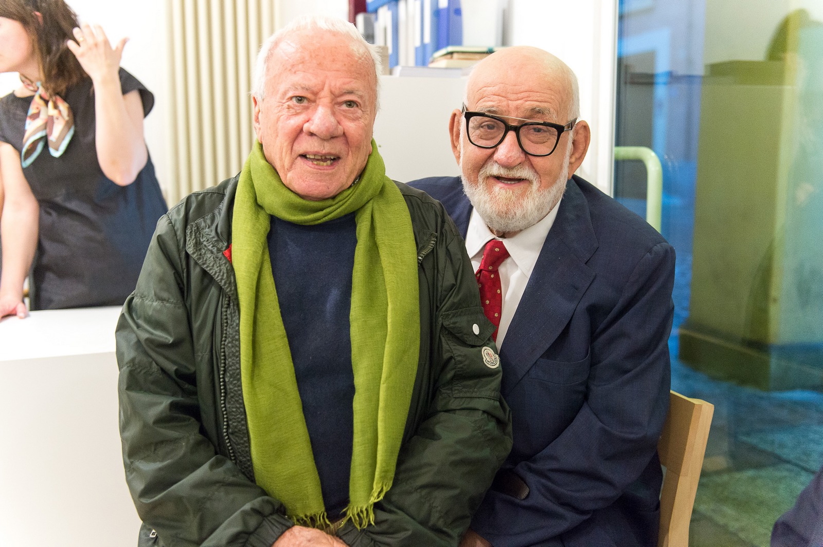 Achille Bonito Oliva ed Emilio Mazzoli alla mostra di Giuseppe Gallo, Caverna di Kant, Galleria Mazzoli, Modena, 2019. Courtesy Galleria Mazzoli, Modena. Ph. Rolando Paolo Guerzoni