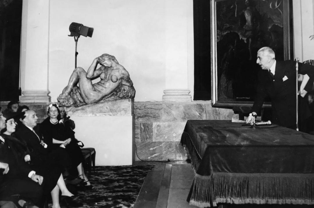 «La portinaia (Concierge)», 1883-84, è uno dei capolavori più noti di Medardo Rosso (1858-1928), lo scultore italiano vissuto lungamente in Francia che rivoluzionò gli statuti della scultura con le sue opere sfaldate nell’atmosfera, in cui «fissava» nella materia immagini fuggevoli, non meno che con la scelta di soggetti, come questo, «altri» rispetto a quelli della scultura celebrativa allora dominante. Se poi si tratta, fra i diversi esemplari, di quello appartenuto a Gustavo Sforni (1888-1939), artista, mecenate e collezionista d’arte d’avanguardia fra i massimi del primo ‘900, personaggio dal gusto finissimo e dalle scelte infallibili, allora il valore storico e artistico dell’opera si moltiplica.