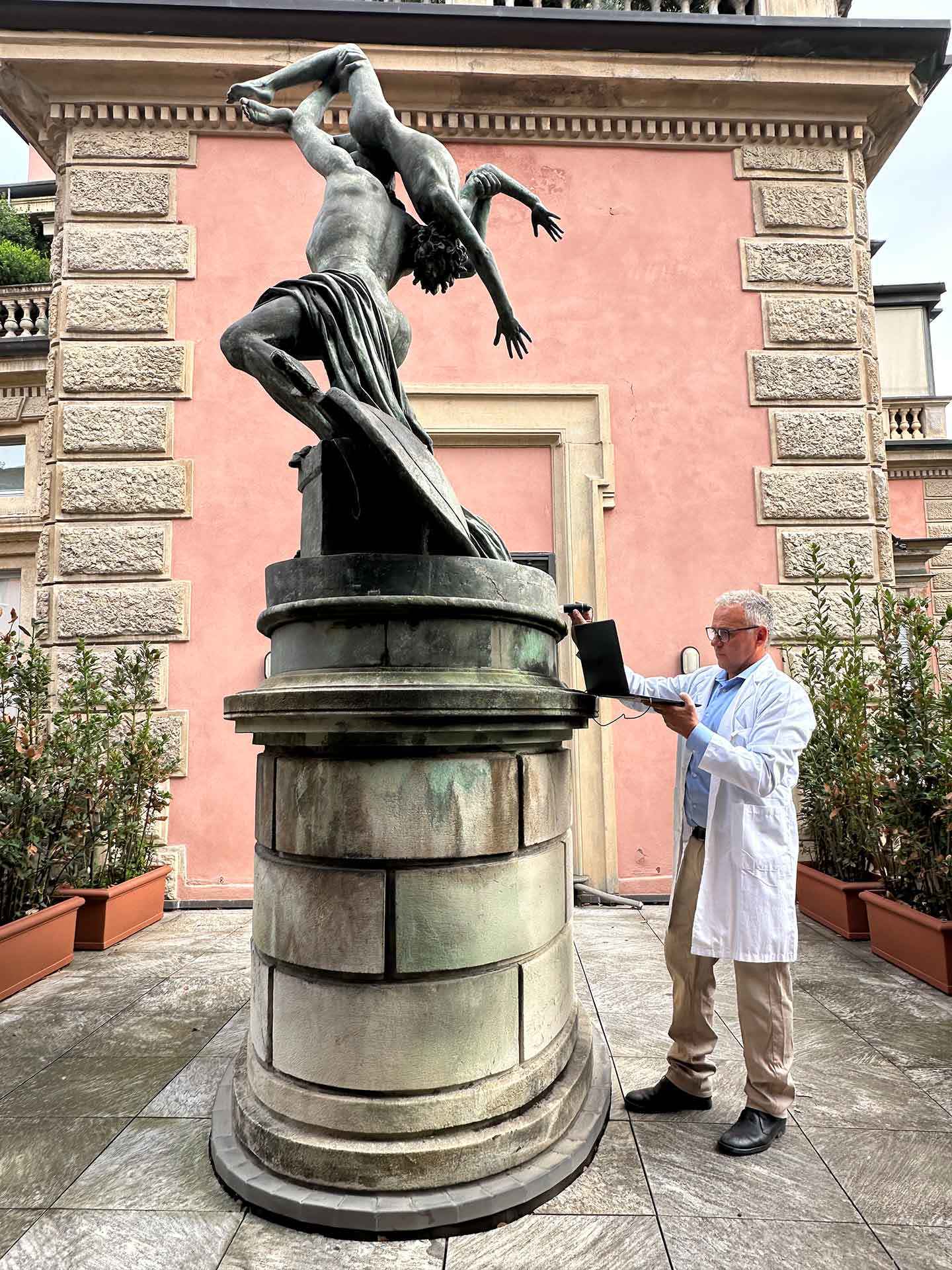 Un momento del restauro del gruppo scultoreo che Rosa Trivulzio commissionò a Lorenzo Bartolini, che narra l’episodio in cui il guerriero greco Pirro solleva il figlio di Ettore, Astianatte