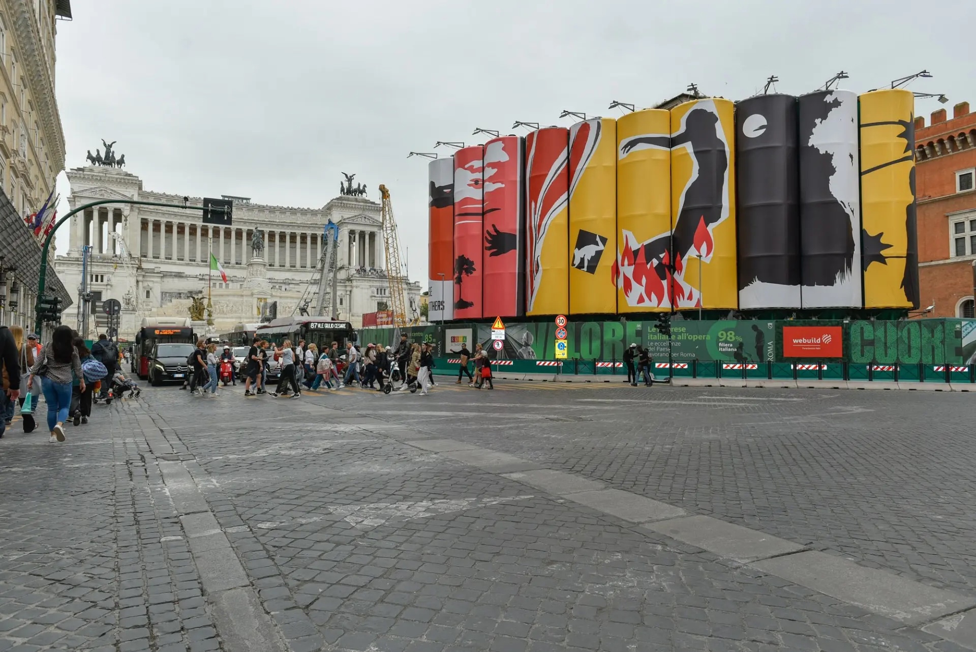A Piazza Venezia, i silos del cantiere della futura stazione della Linea C diventano tele monumentali. Tre artisti internazionali hanno trasformato il cuore di Roma in un museo a cielo aperto dove mappe celesti, costellazioni, mani operose e strumenti di cantiere hanno dialogato con la storia millenaria della città. Promosso da Metro C, il consorzio guidato da Webuild, il progetto mette in scena l’incontro tra arte, ingegneria, reperti archeologici, flussi cittadini e infrastrutture strategiche, restituendo un senso estetico anche a una fase transitorio di trasformazione urbana.