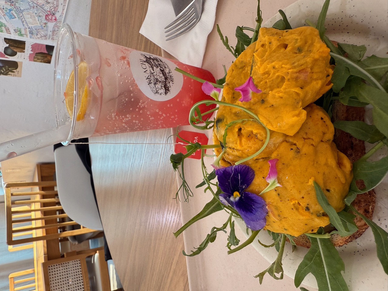 Uno spuntino fiorito: toast con crema di zucca e «Ade» (una spremuta frizzante) al pompelmo rosso. Foto Lara Maria Ferrari