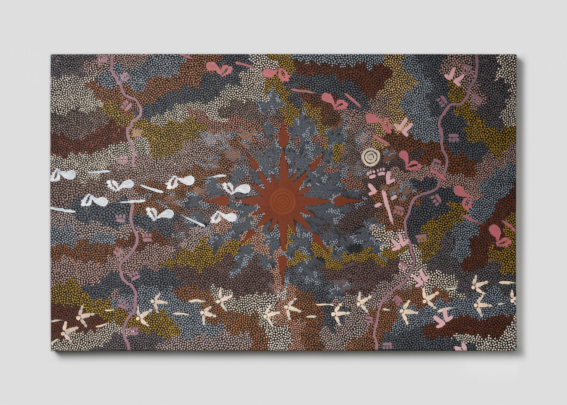 Clifford Possum Tjapaltjarri 1932 - 2002 Warlugulong / Rêve Feu / Fire Dreaming , 1996 Acrylique sur toile de lin Acrylic on canvas 100 x 157 cm (GP POTC - 004.17) Photo : Arthur Péquin © 2025, ProLitteris, Zurich