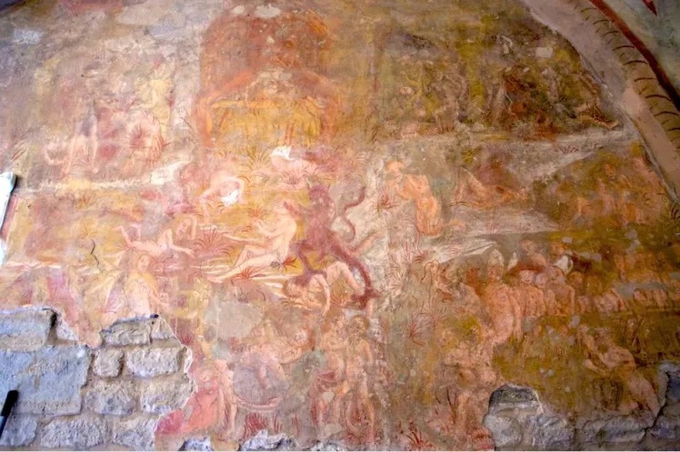 L’origine duecentesca ne attribuisce la fondazione a un ex voto crociato. L’interno, suddiviso in due campate, è coperto da volte a crociera e decorato da affreschi quattrocenteschi (di cui non si conosce con esattezza l’autore), rappresentanti Santa Caterina, la Crocefissione, e un suggestivo Giudizio Universale contrapposto alla raffigurazione dell’Inferno. Gli affreschi dell’oratorio di Santa Caterina sono stati staccati per poterli meglio conservare. Davanti all’altare, di fattura moderna, il piccolo sarcofago di Sant’Acazio del XIII secolo.