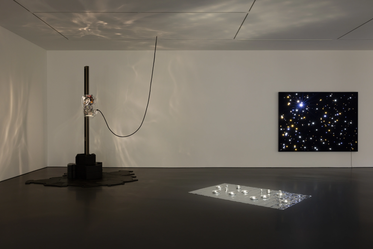 Il tempo che ritorna. Si inceppa. Si ripete. In «Footnote (...my distance from the object...)» (2021) di Rosa Barba, un frammento di testo manoscritto, retroilluminato e impresso su pellicola 70 mm, è intrappolato in un loop infinito. Un pensiero ricorrente e un presagio che non si dissolve. Angela Bulloch, con «Night Sky: Capricorn Into Aquarius» (2025), guarda invece alla soglia di un cambiamento epocale. Utilizzando un programma che mappa le stelle in un modello 3D dell’universo, rappresenta una porzione di cielo da una prospettiva impossibile dalla Terra. Dominique Gonzalez-Foerster resta invece ancorata al suolo con «Untitled» (1987/2015) – opera che trasforma un telo di sopravvivenza in coperta da picnic. Un tempo che slitta, una funzione che cambia e uno spazio di svago come urgente necessità.