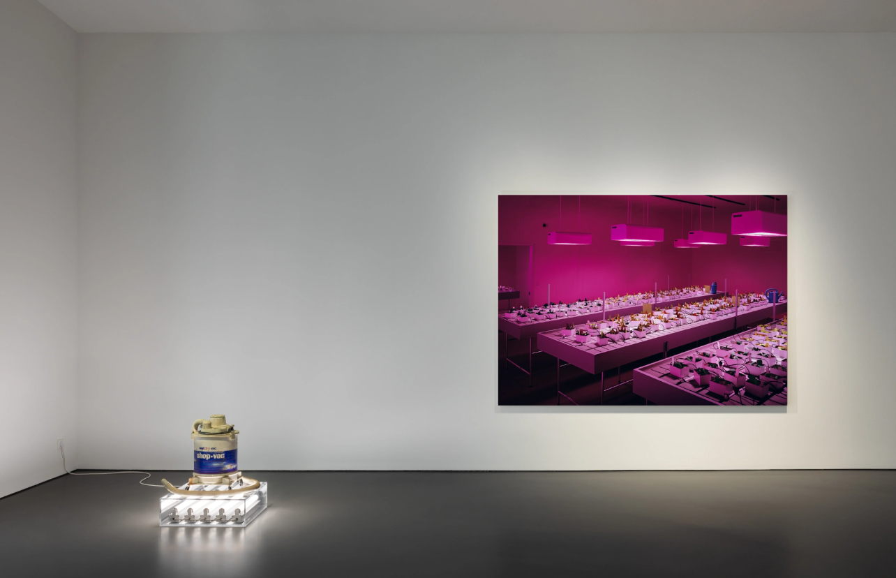 Anche Anicka Yi lavora con l’intelligenza non umana. «LKñL§RHR†ßñ§» (2023) è un dipinto realizzato in collaborazione con un algoritmo progettato e alimentato dall’artista, guidato nell’esplorazione di forme acquatiche, fungine e microbiche. A questa proliferazione risponde un ordine apparente. «Nursery» (2020) di Thomas Demand mostra piante disposte con precisione su lunghi tavoli, illuminate da una luce rosa teatrale. È il laboratorio idroponico del Niagara College in Ontario, all’epoca leader mondiale nella produzione commerciale di cannabis. Qui il tempo è denaro. Ma il consumo lo dissolve, lo piega, lo perde. Saâdane Afif, con «Old Shop-Vac Wet / Dry» (2025), affronta il consumo con ironia. Un omaggio a Jeff Koons costruito attraverso aspirapolvere obsoleti recuperati nei sobborghi americani. Ready-made, performance, riproduzione meccanica: tutto viene perforato. Smontato. Riattivato.
