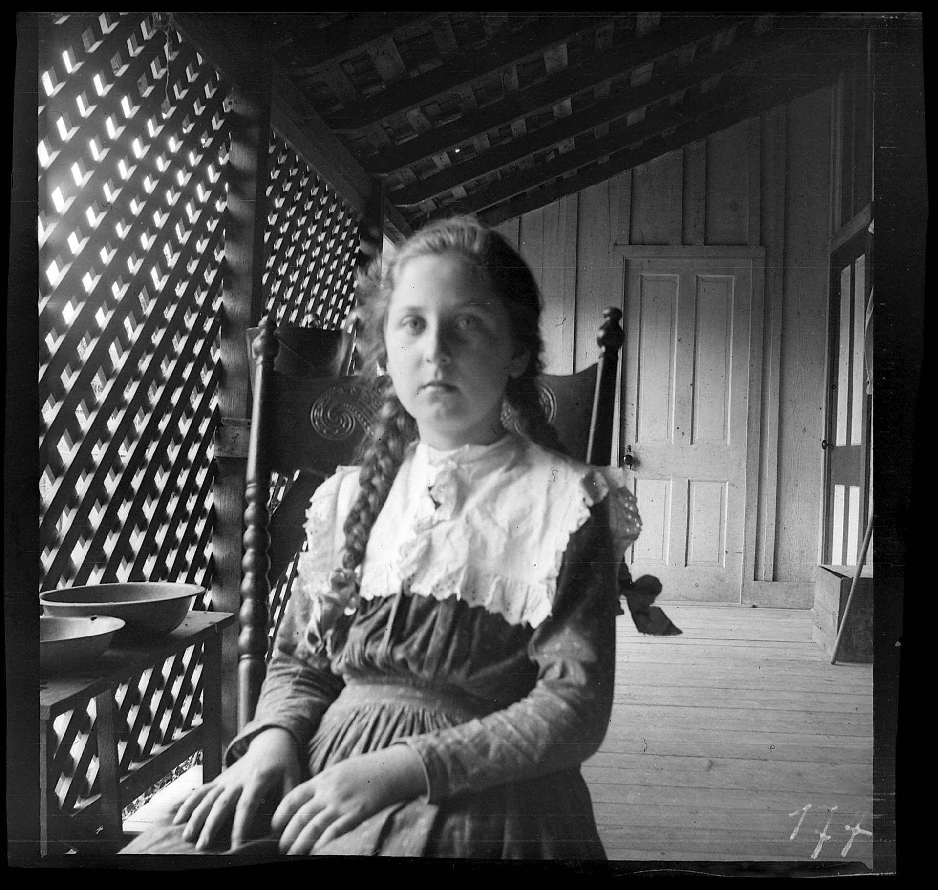 Gabriele Münter, Girl with Braids Seated on the Porch, Moorefield, Arkansas, luglio 1900. Stampa alla gelatina d’argento, 8,9 × 8,9 cm. The Gabriele Münter and Johannes Eichner Foundation, Monaco, n. 3691. © 2025 Artists Rights Society (ARS), New York / VG Bild-Kunst, Bonn.