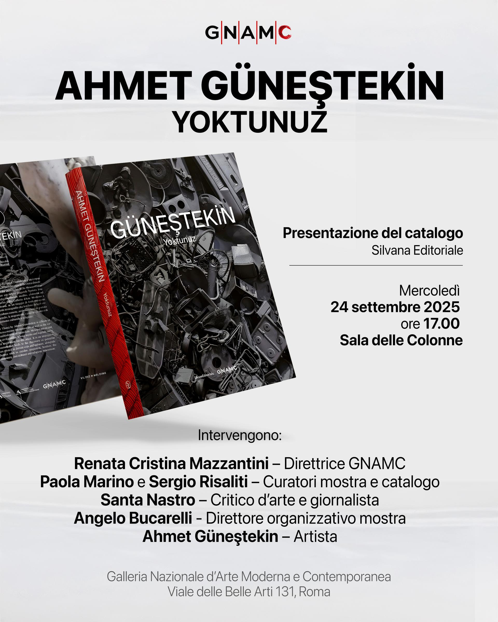 Leggi i suoi articoliIn occasione della mostra «YOKTUNUZ» di Ahmet Güneştekin (Batman, 1966), in corso fino al 28 settembre alla Galleria Nazionale d’Arte Moderna e Contemporanea di Roma, viene presentato il catalogo omonimo, pubblicato da Silvana Editoriale. Un volume che accompagna l’esposizione e ne amplia il respiro, raccogliendo immagini, riflessioni e testi critici intorno a un progetto che ha segnato un momento di particolare intensità nella programmazione della Galleria. La presentazione è fissata per il 24 settembre, ore 17.00, nella Sala delle Colonne.