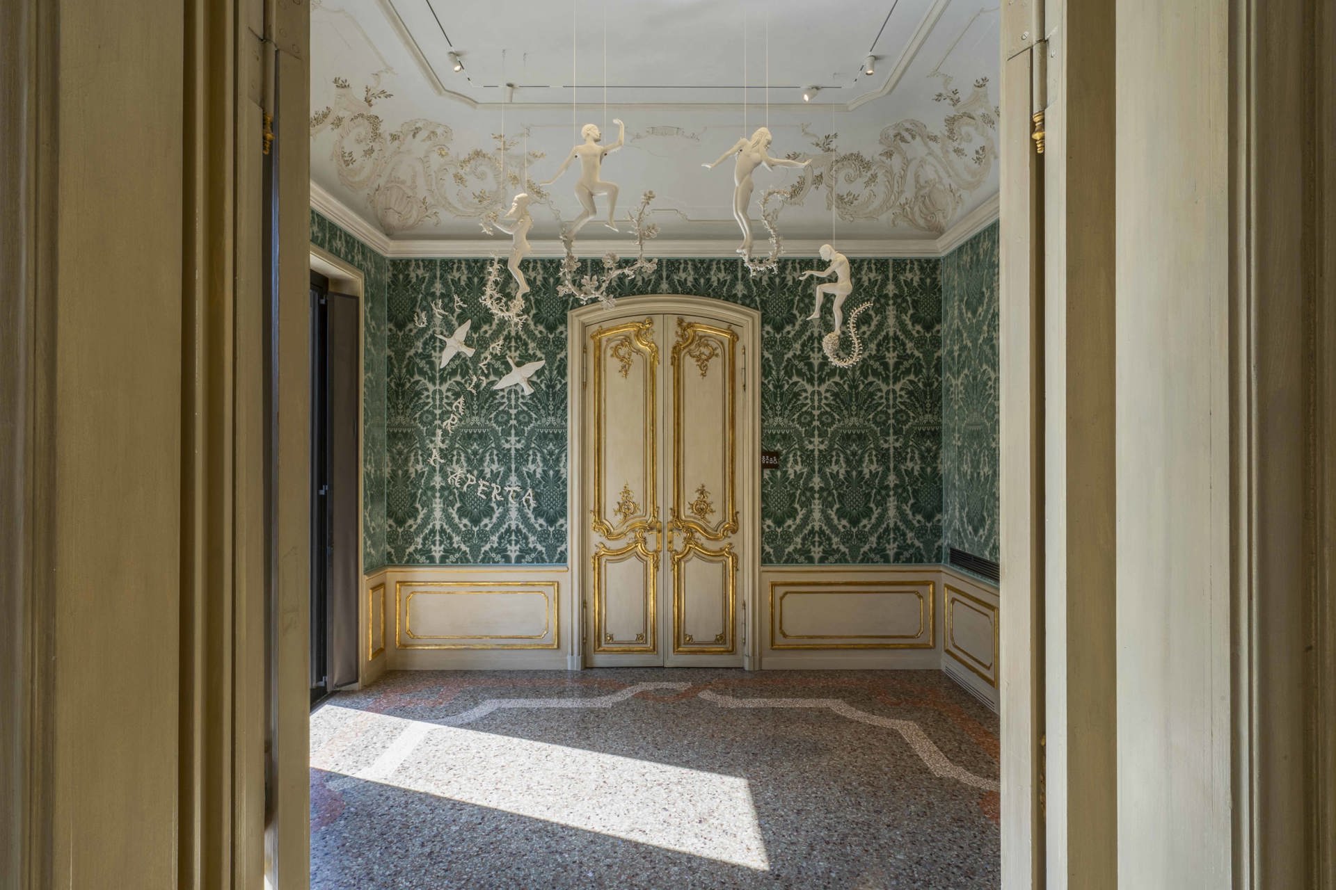 Oltre alla facciata interna, ora animata da alberi fantastici e animali, altre sue figure metamorfiche, in cui l’umano si ibrida con il vegetale, il reale con il mitologico, abitano infatti in permanenza tanto l’atrio della Fondazione (nei medaglioni che evocano le antefisse dei templi etruschi) quanto la sala d’ingresso al piano nobile, dove dal soffitto pende una ghirlanda di figure dai tratti vagamente etruschi, che s’inseguono «galleggiando» nell’aria, mentre nello Spazio Bianco è ricostruito l’atelier nel quartiere di Scampia dove i suoi lavori fiabeschi prendono forma. Perché sono lo stupore e la meraviglia il tema unificante dell’alfabeto di questo artista che, formatosi prima all’Accademia di Belle Arti di Napoli poi a Berlino, dove si è diplomato alla Weißensee Kunstochschule, è tornato «a casa» e ha creato un laboratorio in cui, con alcuni collaboratori, dà vita con la porcellana a un mondo costantemente attraversato dalla magia.