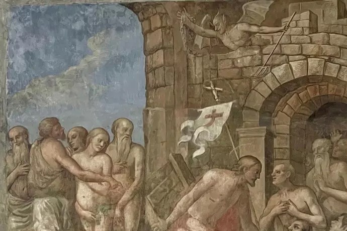 Influenzata da modelli figurativi cinquecenteschi, la composizione tratta il tema della redenzione universale. Cristo risorto, con la croce a stilo e le simbologie della vittoria sulla morte, scende agli Inferi abbattendone le porte e liberando Adamo, Eva, Giovanni Battista e i profeti. La scena si sviluppa all’interno di un’architettura dipinta che dà vigore alla narrazione dell’opera.