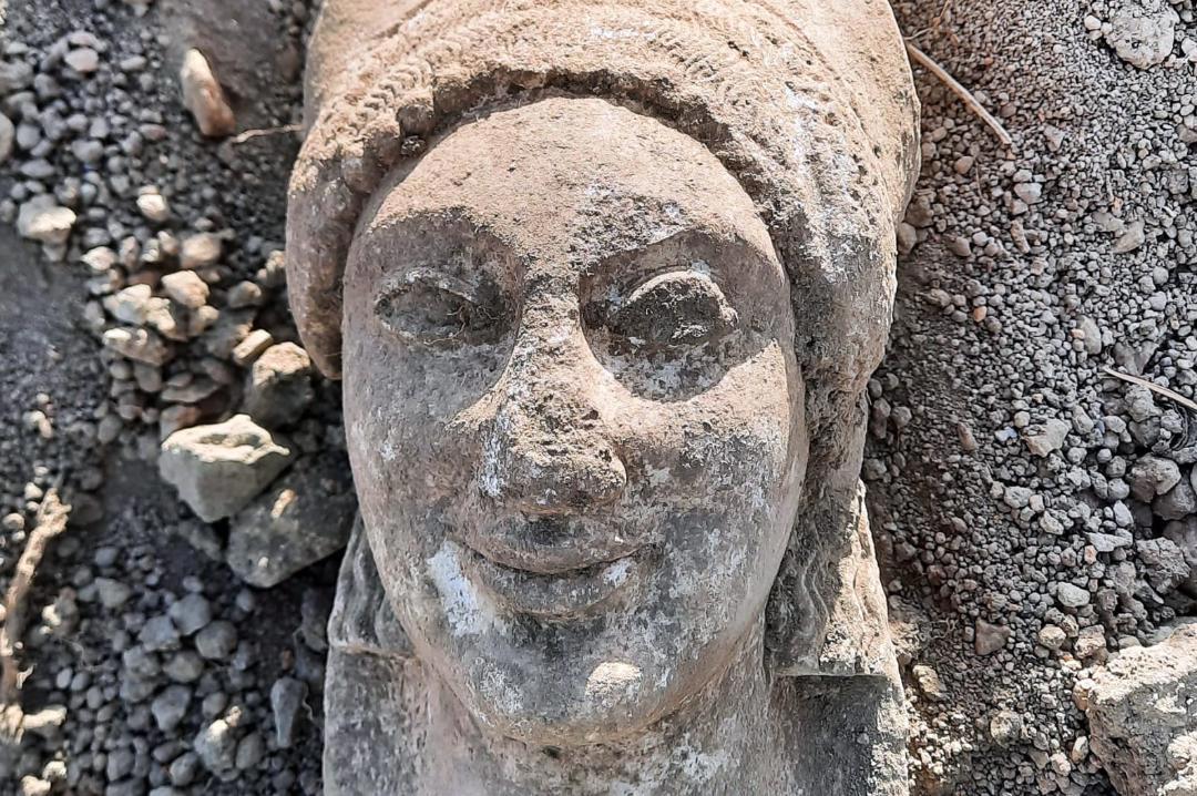 Un uomo e una donna, forse una coppia di sposi, su un rilievo funebre a dimensioni quasi reali pertinente a una tomba monumentale presso la necropoli di Porta Sarno, fuori le mura di Pompei. Nell’area, indagata dal luglio 2024, in precedenza erano state individuate oltre 50 sepolture a cremazione. Il simbolismo degli accessori scolpiti della donna potrebbe identificarla come una sacerdotessa di Cerere. La qualità dell’intaglio nelle sculture e le loro caratteristiche arcaiche suggeriscono una datazione al periodo tardo-repubblicano.