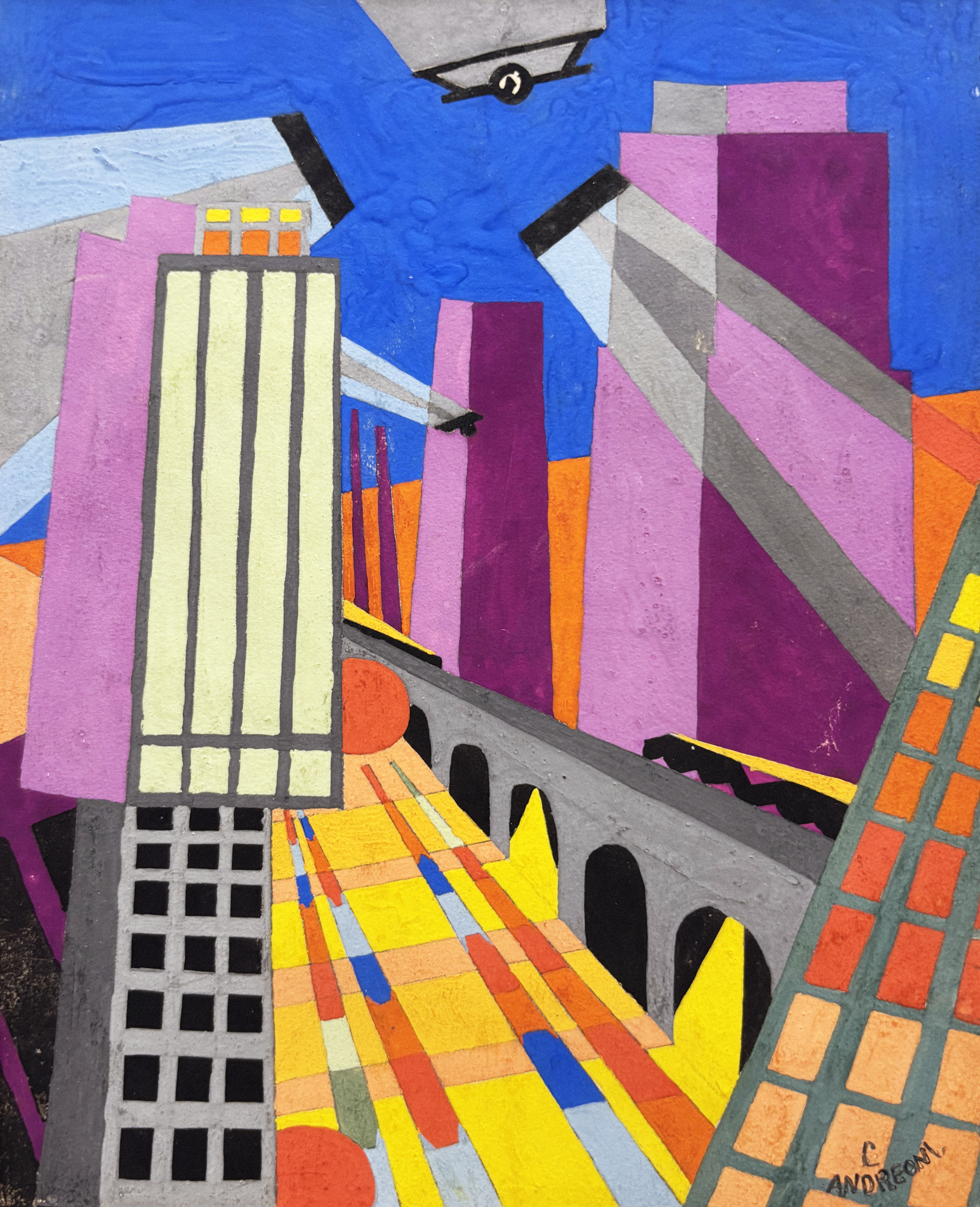 Ed è proprio dall’iniziale interesse per la «meccanica moderna» che Andreoni aderisce formalmente al Movimento Futurista nel 1924, in occasione del primo Congresso Futurista di Milano. Nel 1931 firma il Manifesto con gli aeropittori milanesi (Munari, Duse, Manzoni, Gambini, BOT). Le sue tele si aprono su metropoli sorvolate da aeroplani, viadotti, grattacieli e prospettive spezzate; nelle chine e negli acquerelli, il volo diventa invece metafora dello sguardo moderno, lucido, analitico e privo di nostalgia. Nel 1928 Andreoni apre a Milano la Bottega d’Arte Futurista, un laboratorio che produce oggetti d’uso, tessuti, abiti e arredi. L’esperienza, coerente con il manifesto di Balla e Depero del 1915, mette in pratica l’idea di un’arte estesa a ogni ambito della vita quotidiana. In questa dimensione “operativa” del fare – tra artigianato, progettazione e estetica – si riconosce uno dei contributi più originali dell’artista al linguaggio futurista.