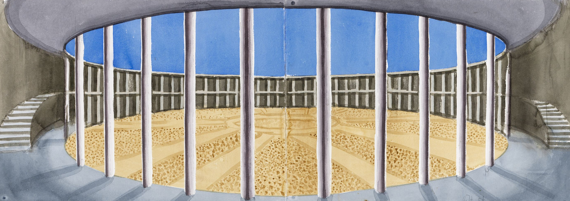 Il soggetto – il cortile circolare del palazzo rinascimentale incastonato nel complesso moresco dell’Alhambra – è solo in apparenza architettonico. In realtà, Hockney vi costruisce un dispositivo percettivo. La luce scivola tra le colonne, le ombre ruotano come lancette di un tempo ipotetico, l’azzurro del cielo ripete la curva del pavimento. È una riflessione sul vedere, sull’ordine e sul disordine, su quella tensione fra misurabilità e emozione che attraversa tutta la sua opera.