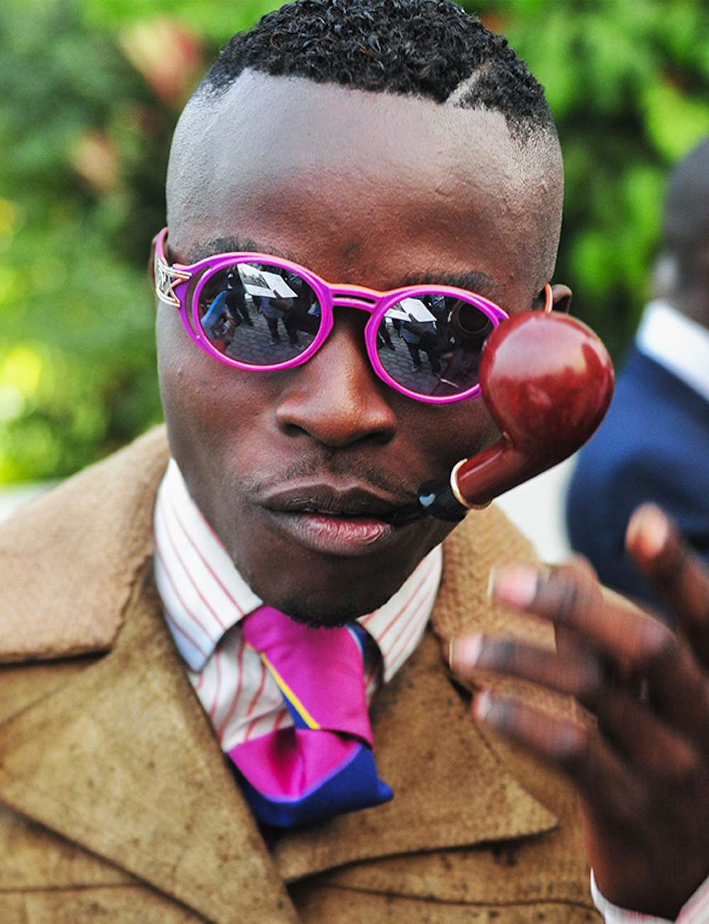 Novanta sue immagini selezionate da Aïda Muluneh e Chiara Bardelli Nonino compongono la mostra «Daniele Tamagni. Style is Life», presentata a Milano da Palazzo Morando | Costume Moda Immagine, con Daniele Tamagni Foundation, dal 9 febbraio al primo aprile. In apertura, le sue immagini più famose, quelle dei «sapeurs» congolesi: non vigili del fuoco né guastatori dell’esercito (ma questo un po’ sì), bensì i coloratissimi appartenenti alla Sape, Società degli Animatori e delle Persone Eleganti, detti i «dandy di Bacongo», quartiere di Brazzaville, Repubblica del Congo, che vestono sgargianti completi di raso, completati da accessori non meno chiassosi, manifestando così una forma di resistenza culturale nei confronti dei bianchi, di cui imitano, stravolgendoli ironicamente, i codici vestimentari: ecco allora, nell’immagine più celebre del libro Gentlemen of Bacongo, 2009, il giovane uomo, completo rosa, bombetta, cravatta, pochette e scarpe stringate rosse, grosso sigaro tra i denti, avanzare soddisfatto fra persone scamiciate, con le infradito di plastica ai piedi.