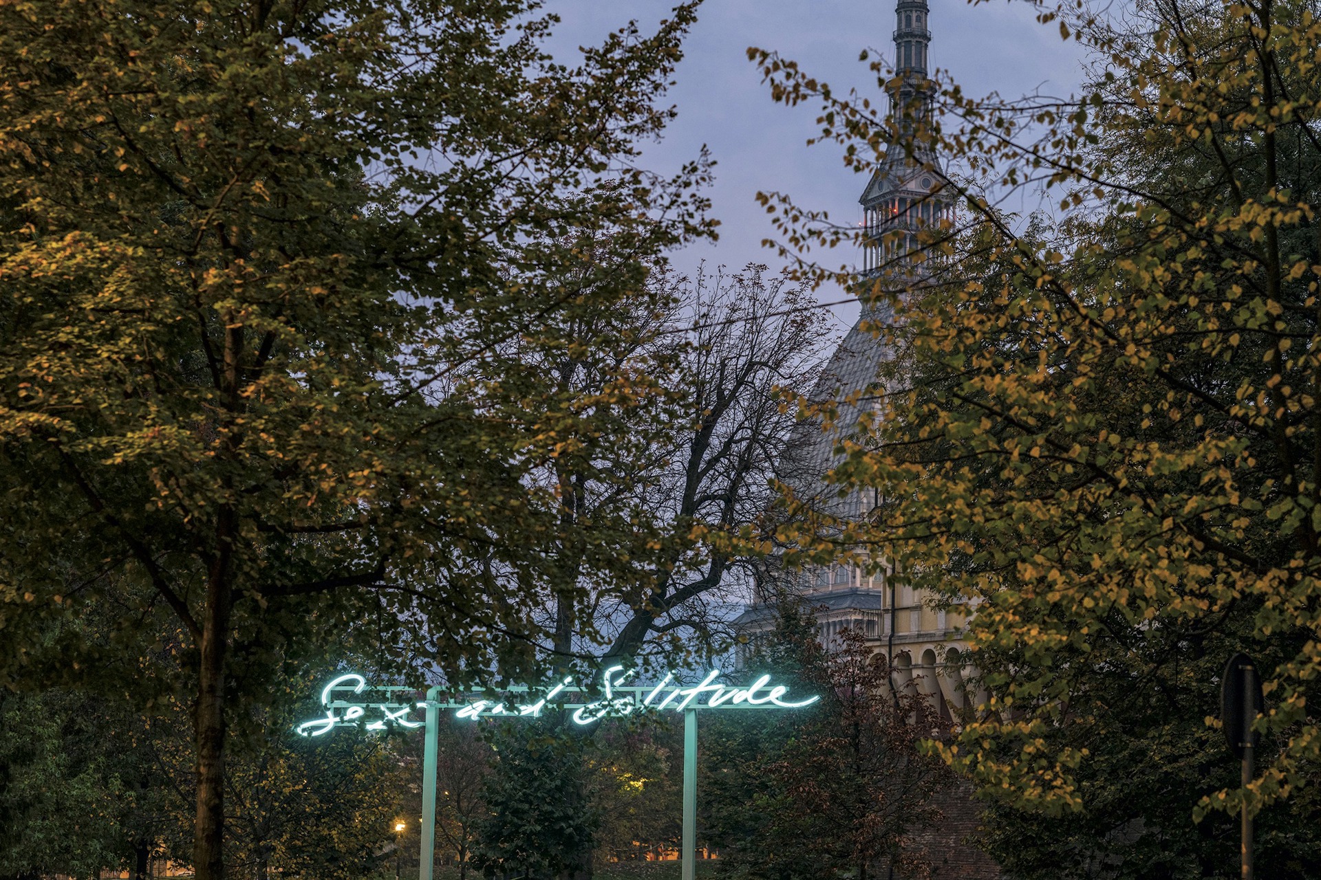 Tracey Emin è una delle artiste più importanti del nostro tempo. Ha saputo usare il neon in modo del tutto diverso rispetto alla tradizione concettuale degli anni Sessanta e Settanta. Mentre artisti come Kosuth o Nauman lo usavano in chiave razionale, analitica, Emin ne ha fatto un linguaggio emotivo, intimo, quasi diaristico. Ha riportato il neon alla vita, alla fragilità e all’umanità dei sentimenti. Nel suo caso le parole sono tutto: scrive frasi brevi, a volte solo tre o quattro parole, ma bastano a trasmettere un dolore, un desiderio, un’intera biografia. È una scrittura personale, tracciata con la sua calligrafia, che diventa luce e voce. Il suo lavoro, «Sex and Solitude», è esposto nella parte bassa dei Giardini Reali, dove diventa una presenza sospesa tra introspezione e spazio urbano.
