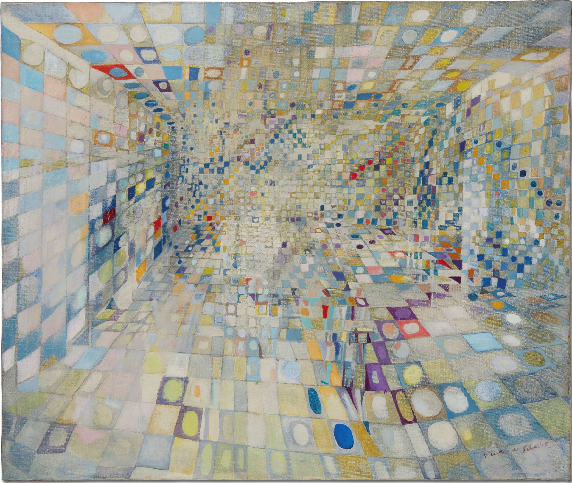 Maria Helena Vieira da Silva, Le Couloir ou intérieur (Il corridoio o interno), 1948, olio e grafite su tela, 46 × 55 cm, collezione privata, © Maria Helena Vieira da Silva, VEGAP, Bilbao 2025.