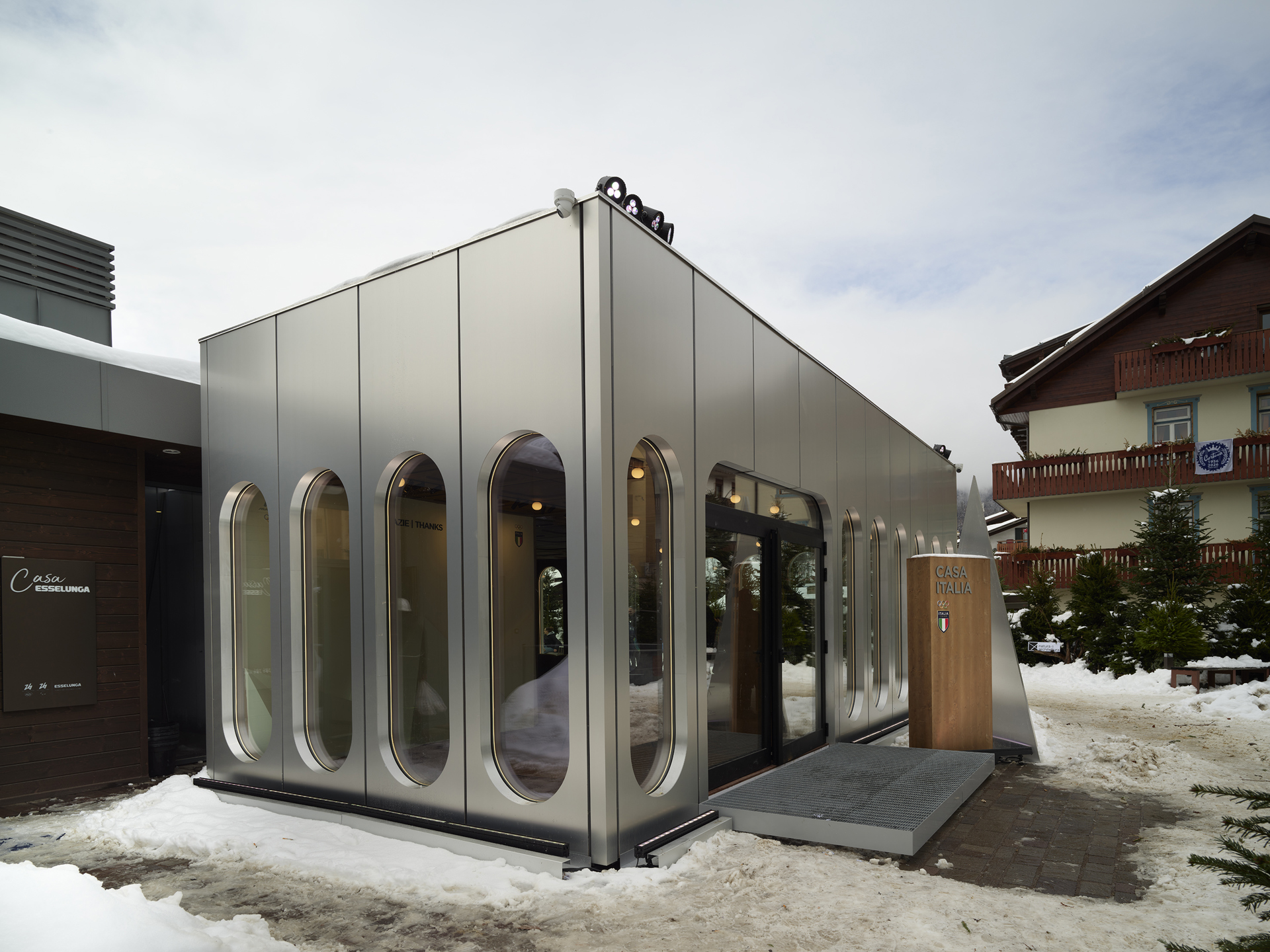 In tutte e tre le sedi l’accesso è segnato da un portale in pannelli di alluminio riflettente, soglia simbolica e architettonica, accompagnata da un intervento di John Giorno concepito come varco poetico e visivo. A Milano e Livigno il wall painting We Gave a Party for the Gods and the Gods All Came (2026) invita a leggere il linguaggio come esperienza visiva, poetica e spirituale; a Cortina l’opera, nella sua versione italiana Abbiamo dato una festa per gli Dei e tutti gli Dei sono venuti, dialoga con la casa come spazio di pluralità e condivisione. Il progetto architettonico interpreta MUSA a partire dal paesaggio montano, elemento fondante naturale e simbolico: l’allestimento costruisce un fil rouge comune fra le tre sedi secondo principi di leggerezza, temporaneità e rispetto del contesto, con riferimenti alle infrastrutture sportive e all’architettura di montagna — dai bivacchi ai sistemi di risalita — attraverso forme modulari e seriali che evocano movimento e spirito tecnico. Il binomio materico tra alluminio e legno sintetizza la visione: all’esterno l’alluminio riflettente richiama i rifugi d’alta quota e smaterializza l’architettura nel paesaggio; all’interno il legno restituisce una dimensione calda e accogliente, riaffermando ospitalità e senso di casa.