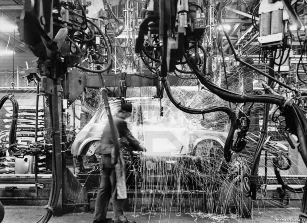 Stabilimento Mirafiori, lavorazione scocche in linea di saldatura, Quartiere Mirafiori Sud, 1961 Credits: Centro storico Fiat Archivio: Archivio storico Fiat Città: Torino
