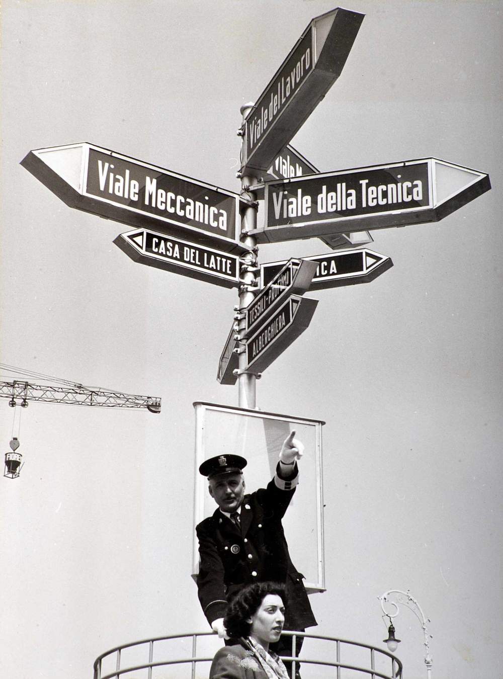 Un vigile all'interno del quartiere fieristico dà indicazioni ai visitatori della Fiera Campionaria di Milano, 1952. Publifoto Credits: Archivio Storico Fondazione Fiera di Milano Archivio: Archivio Storico Fondazione Fiera di Milano Città: Milano