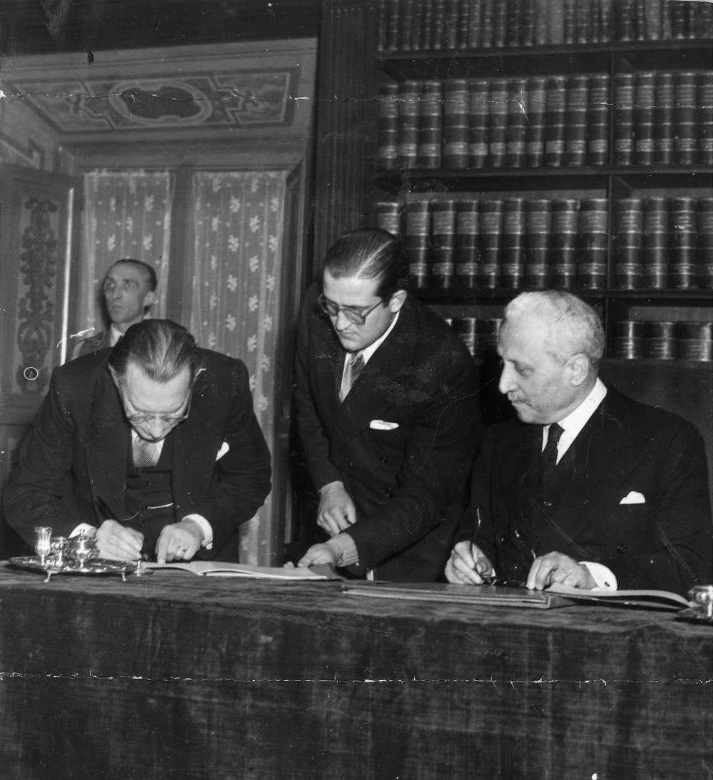 Alcide de Gasperi ed Enrico De Nicola firmano la Costituzione repubblicana. 1 gennaio 1948 Credits: Istituto Luigi Sturzo Archivio: Istituto Luigi Sturzo Città: Roma