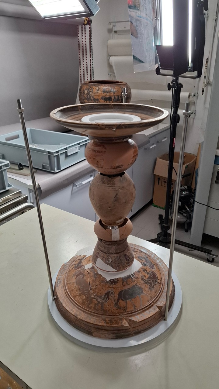 Le indagini diagnostiche (Uv, Xrf, Raman, Ir), effettuate dal Gabinetto di Ricerche Scientifiche dei Musei Vaticani nell’ambito di un recente intervento conservativo condotto sotto la direzione di Maurizio Sannibale, curatore del Reparto Antichità Etrusco-Italiche, hanno permesso di riconoscere con precisione gli interventi moderni e di valorizzare i tratti stilistici originali, confermando un forte legame con la bottega di Sophilos, pur senza un’attribuzione diretta alla sua mano, a cui forse potrebbe essere ricondotto il frammento del piede dell’hypokraterion, unica sua parte originale superstite.