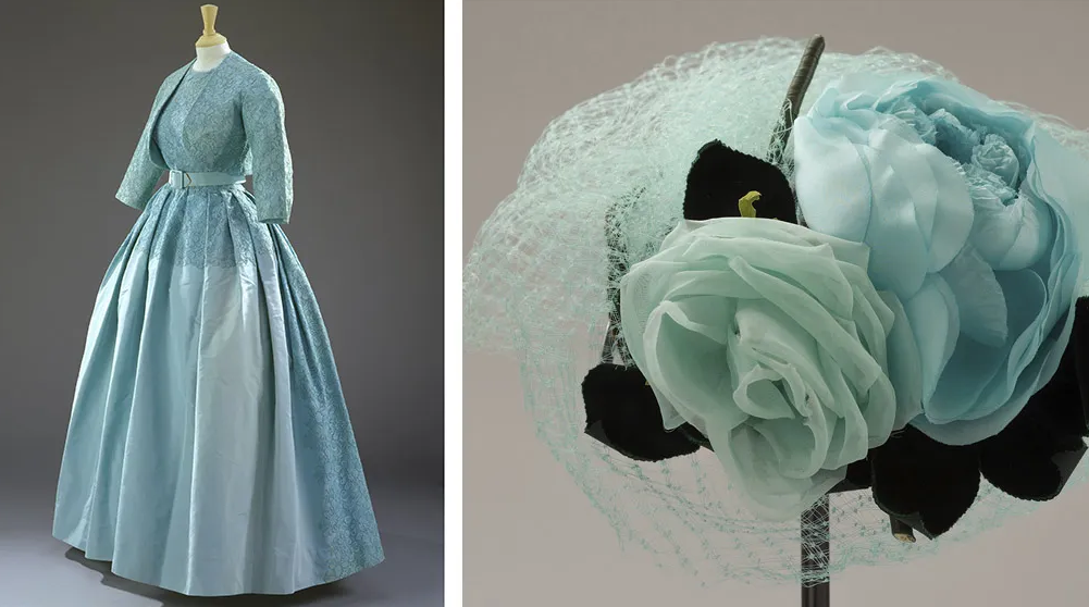 A sinistra: Completo indossato per le nozze della principessa Margaret, Norman Hartnell, 1960. A destra: Cappello indossato per le nozze della principessa Margaret, Claude St Cyr, 1960. Crediti: © Royal Collection Enterprises Limited 2025 | Royal Collection Trust. Fotografo: Jon Stokes.Copyright: Royal Collection Enterprises Limited©